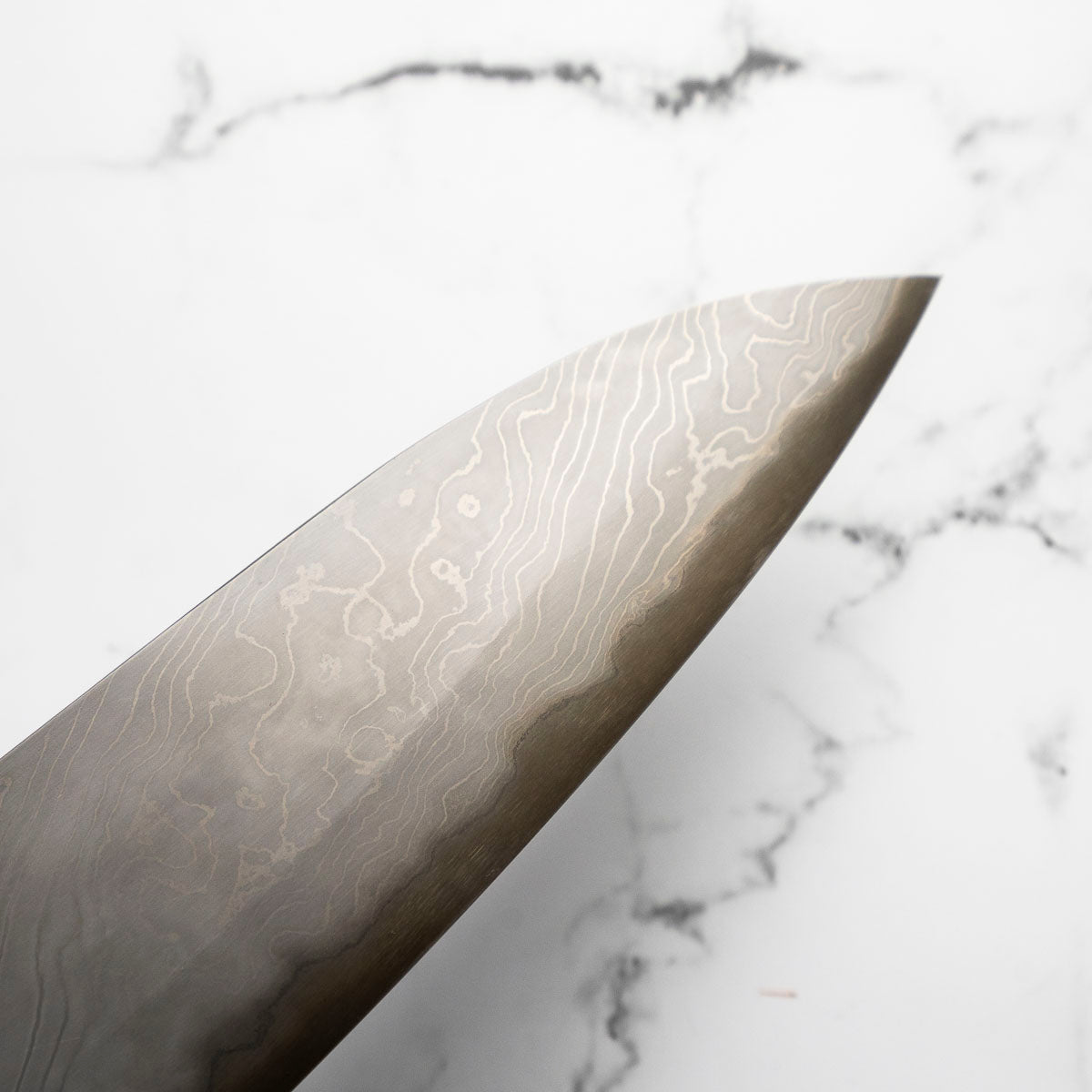 This knife is made from a high-carbon steel and as such, will require a little more care than a regular off-the-shelf knife. It must be dried shortly after use, as prolonged exposure to moisture can cause rust spots to appear. A very light coat of oil during storage also helps to prevent rust spots. A patina (colouration and seasoning of the steel) will occur with use.