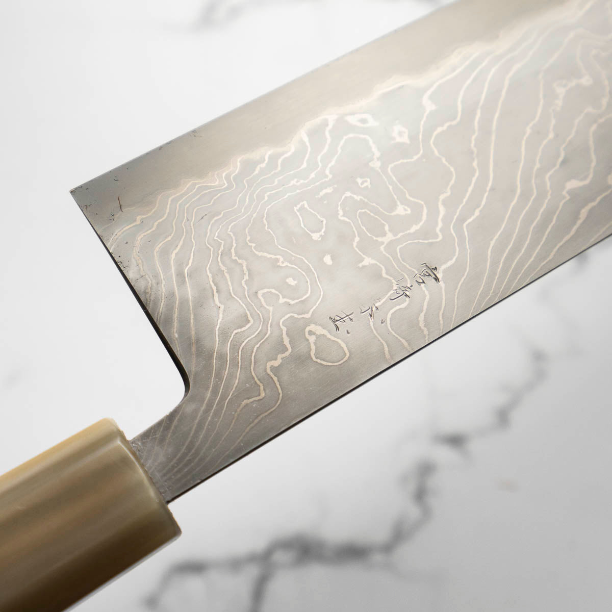 I have had MKs work before and appreciate the work he puts into his blades. No shortcuts (ahem, prelamination) here, he's the real deal. I was told he spends more time on each blade than his contemporaries. The cladding on this one is reminiscent of another famous forge-welded, twist cladding in how the cladding bands continue over the spine of the knife. This one is lasery but has some weight to it and makes cutting a delight. The ootb edge was a little uneven but sharp 8/10. The etching of the blade is a little draggy but I anticipate will dissipate over time with use and some patinizing. All in all, a great blade that is a delight to use and I hope to keep a permanent place in my collection.
