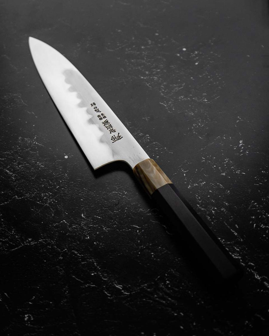 This knife is made from a high-carbon steel and as such, will require a little more care than a regular off-the-shelf knife. It must be dried shortly after use, as prolonged exposure to moisture can cause rust spots to appear. A very light coat of oil during storage also helps to prevent rust spots. A patina (colouration and seasoning of the steel) will occur with use.