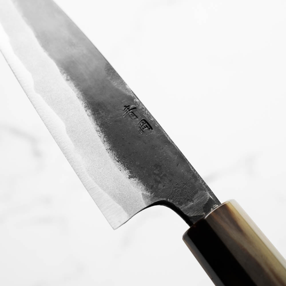 This knife is made from a high-carbon steel and as such, will require a little more care than a regular off-the-shelf knife. It must be dried shortly after use, as prolonged exposure to moisture can cause rust spots to appear. A very light coat of oil during storage also helps to prevent rust spots. A patina (colouration and seasoning of the steel) will occur with use.