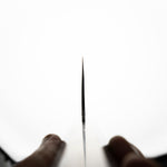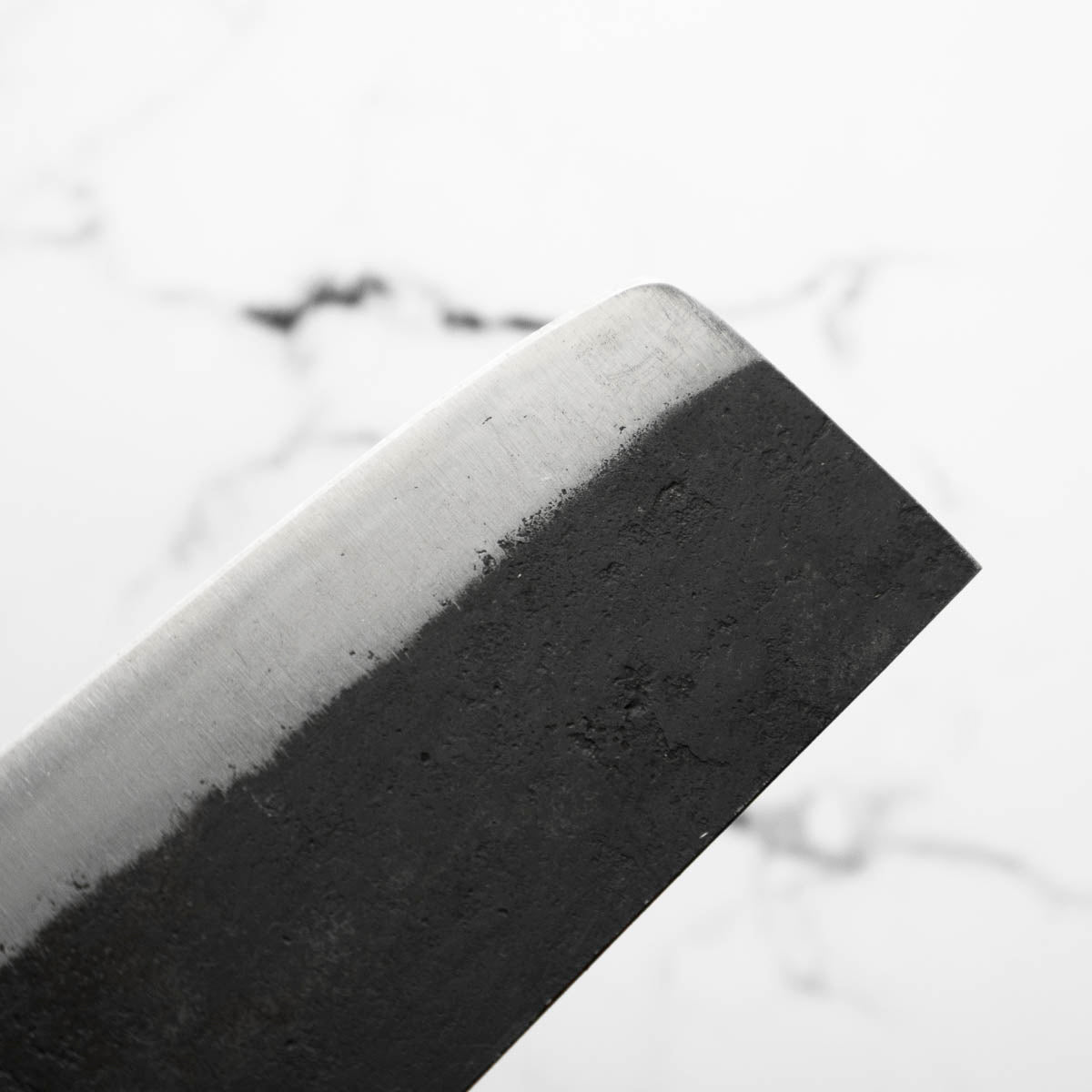 Japanese White Steel #2, a traditional high-carbon steel, is cherished for its purity and fine grain structure, enabling razor-sharp edges, at the cost of being reactive. It is one of the easiest steels to sharpen, but cannot be left wet for even short periods otherwise rust spots can occur. If you’re fastidious in your knife maintenance, this knife steel can be extremely rewarding to use.
