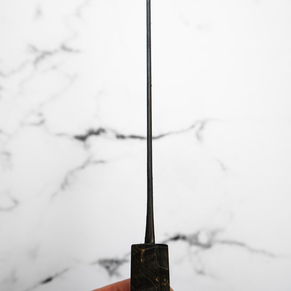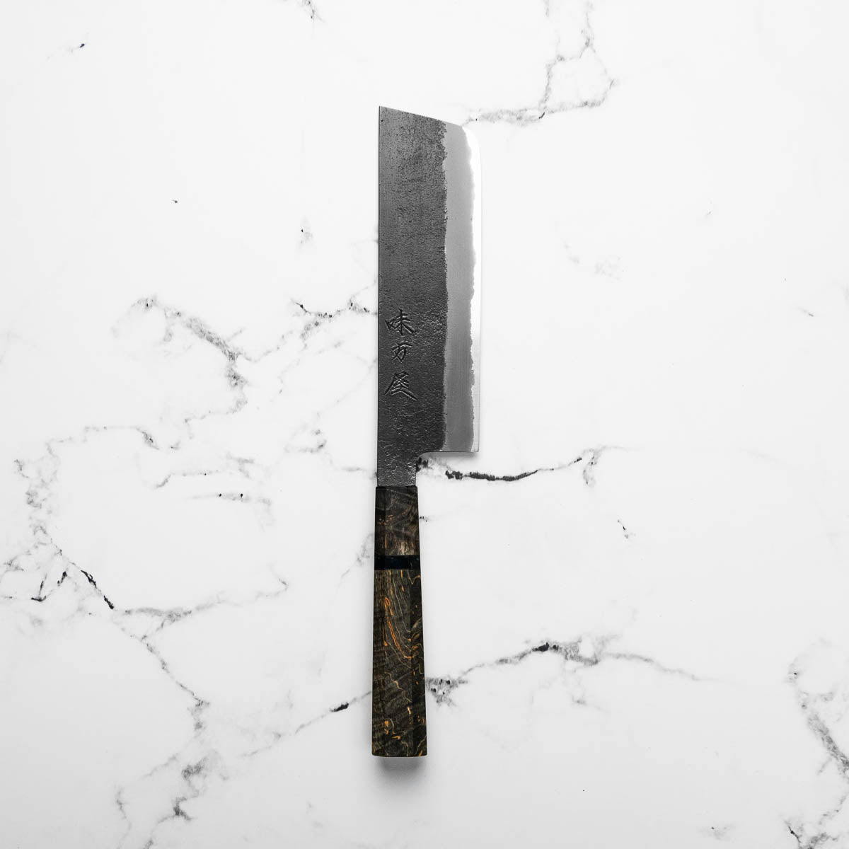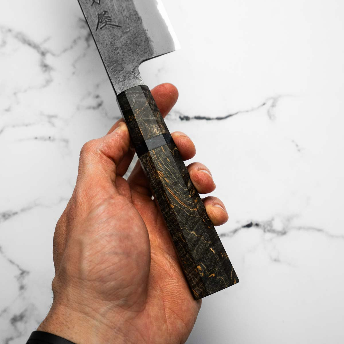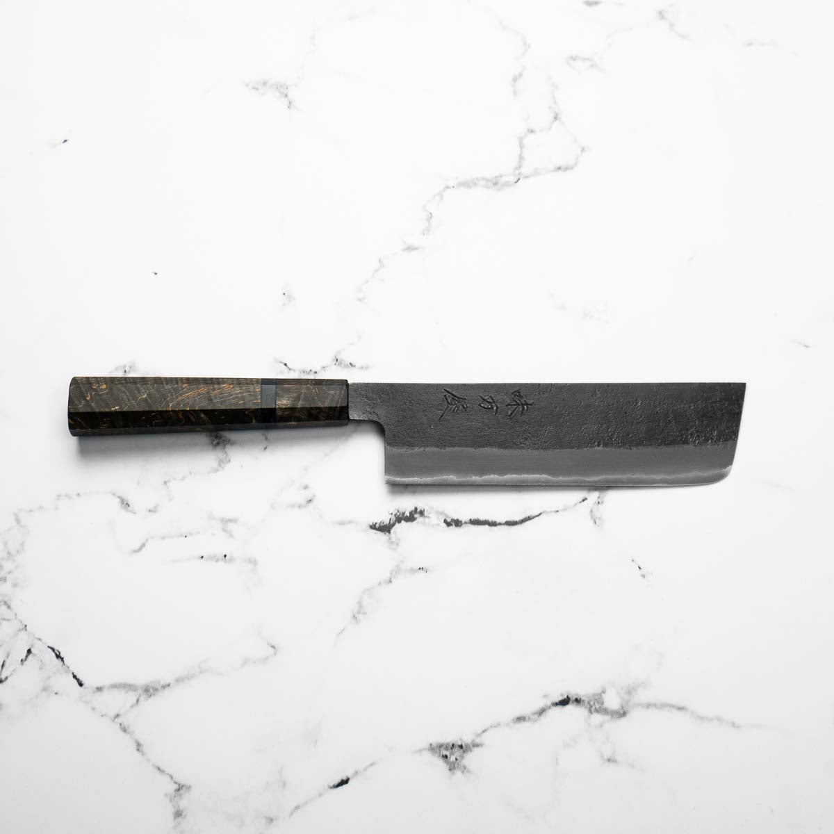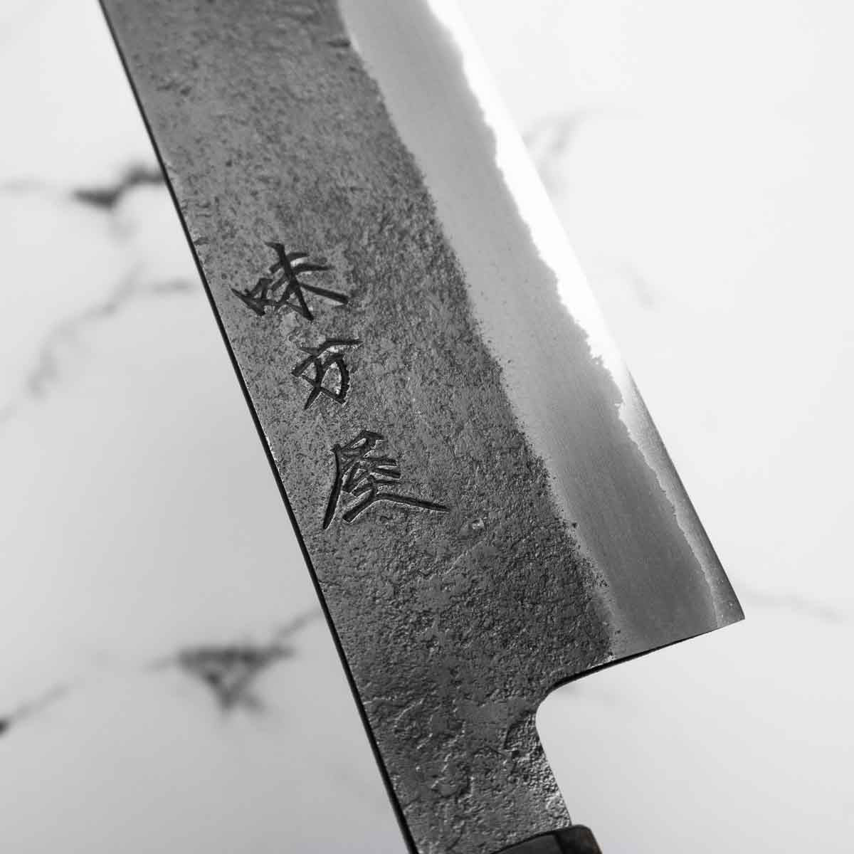 Japanese White Steel #2, a traditional high-carbon steel, is cherished for its purity and fine grain structure, enabling razor-sharp edges, at the cost of being reactive. It is one of the easiest steels to sharpen, but cannot be left wet for even short periods otherwise rust spots can occur. If you’re fastidious in your knife maintenance, this knife steel can be extremely rewarding to use.