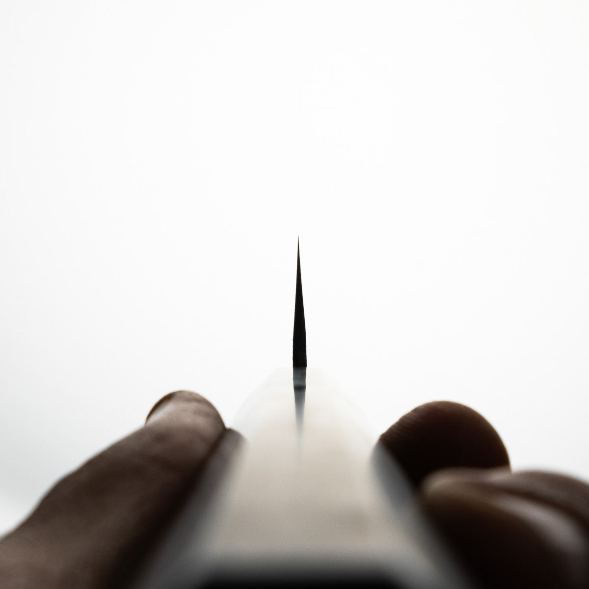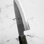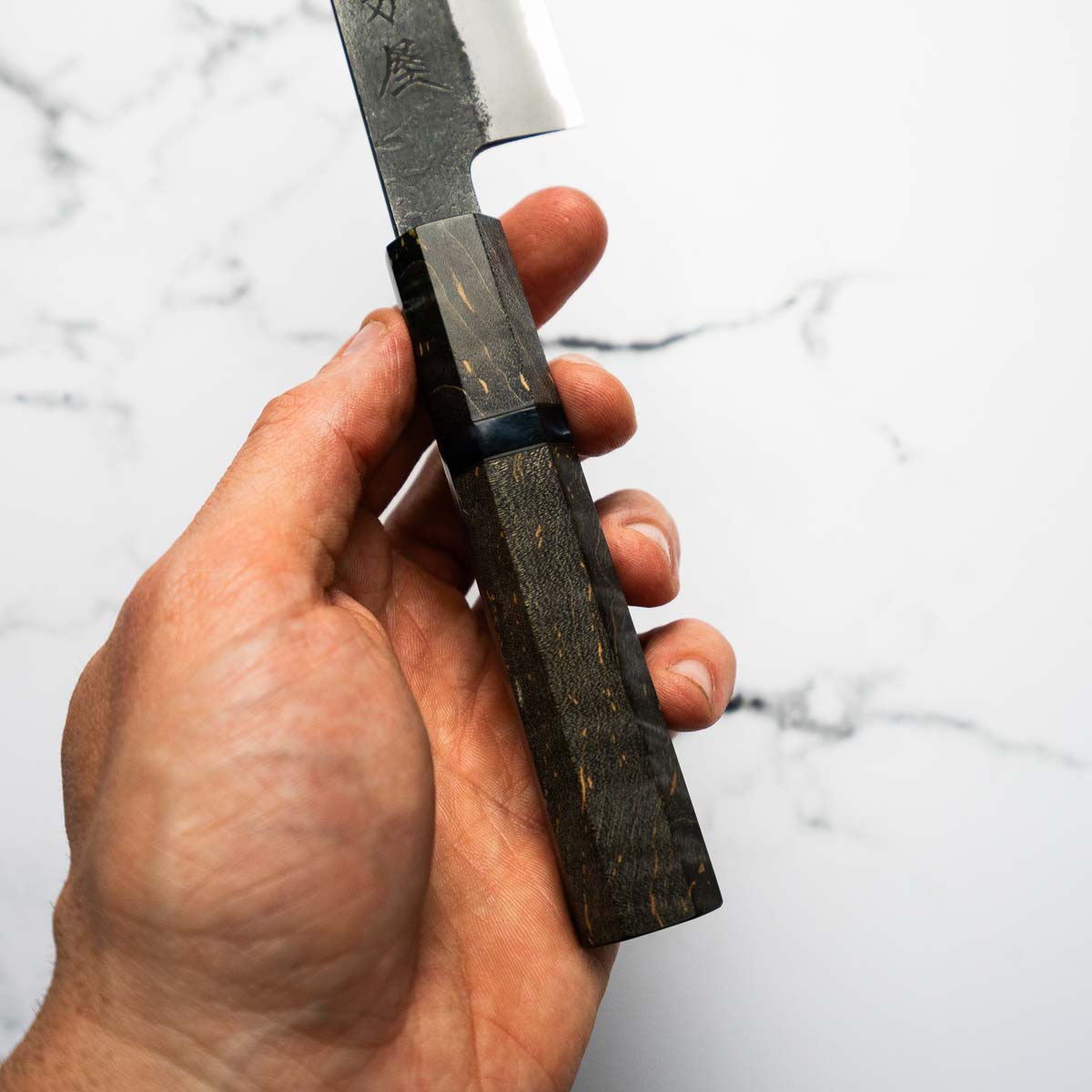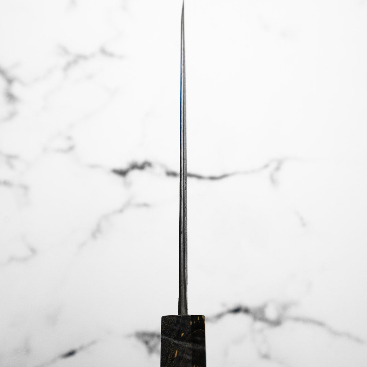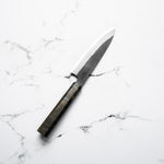 Japanese White Steel #2, a traditional high-carbon steel, is cherished for its purity and fine grain structure, enabling razor-sharp edges, at the cost of being reactive. It is one of the easiest steels to sharpen, but cannot be left wet for even short periods otherwise rust spots can occur. If you’re fastidious in your knife maintenance, this knife steel can be extremely rewarding to use.
