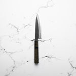 This knife is made from a high-carbon steel and as such, will require a little more care than a regular off-the-shelf knife. It must be dried shortly after use, as prolonged exposure to moisture can cause rust spots to appear. A very light coat of oil during storage also helps to prevent rust spots. A patina (colouration and seasoning of the steel) will occur with use.