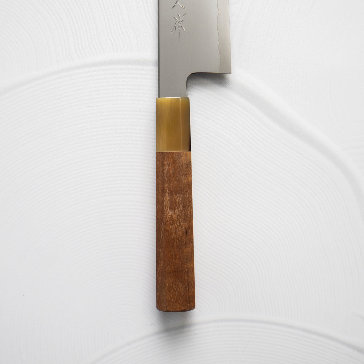 Naohito Myojin is a fast-rising sharpener working out of Kochi prefecture. His work is now in such high demand that long wait times are now the norm. He is the sharpener behind the Tetsujin line and the 'Fujiyama' line by Konosuke.