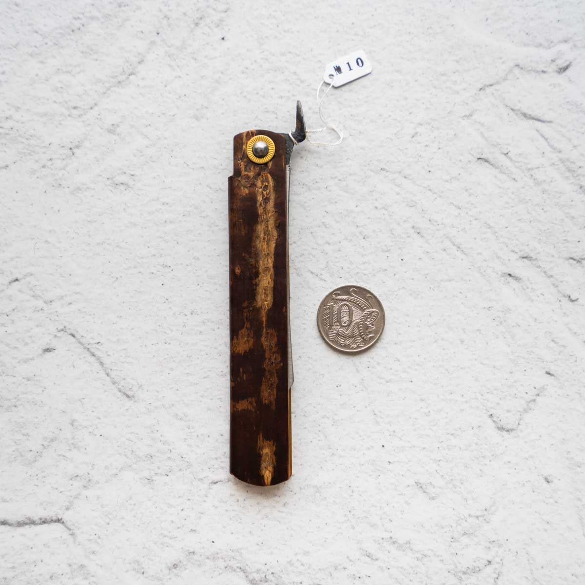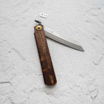 He named it “Higonokami Knife” because many of his customers were in Kumamoto area (formally Higo country), which turned out to dramatically increase his sales. The blades have gradually changed their shapes. Unlike single-edged knives, the double-edged blades (V-shaped cross section) were in those days considered common. The earlier blades had a sharper tip (shape of a bamboo leaf), but now they have square shapes. The sheaths had a vertically folding style and a cross folding style, now the vertical one has to be custom made.