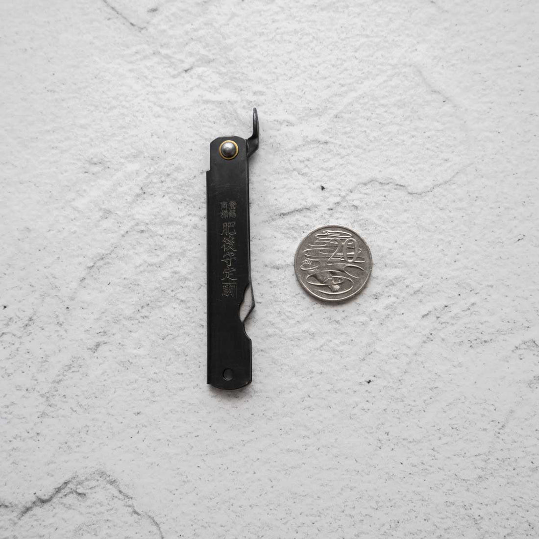 He named it “Higonokami Knife” because many of his customers were in Kumamoto area (formally Higo country), which turned out to dramatically increase his sales. The blades have gradually changed their shapes. Unlike single-edged knives, the double-edged blades (V-shaped cross section) were in those days considered common. The earlier blades had a sharper tip (shape of a bamboo leaf), but now they have square shapes. The sheaths had a vertically folding style and a cross folding style, now the vertical one has to be custom made.