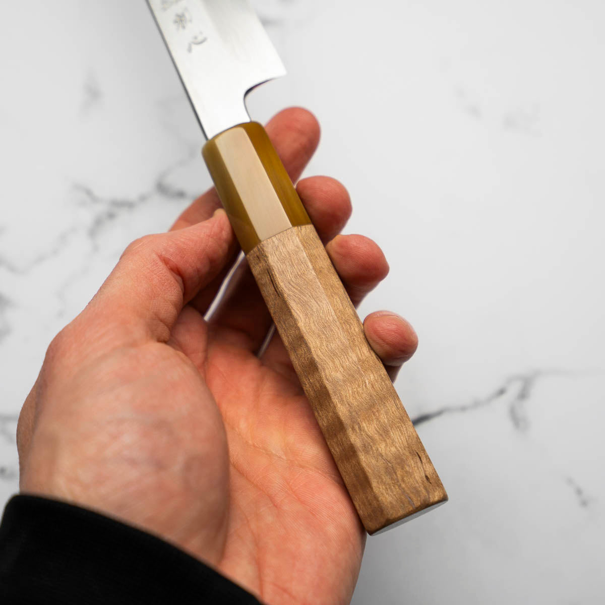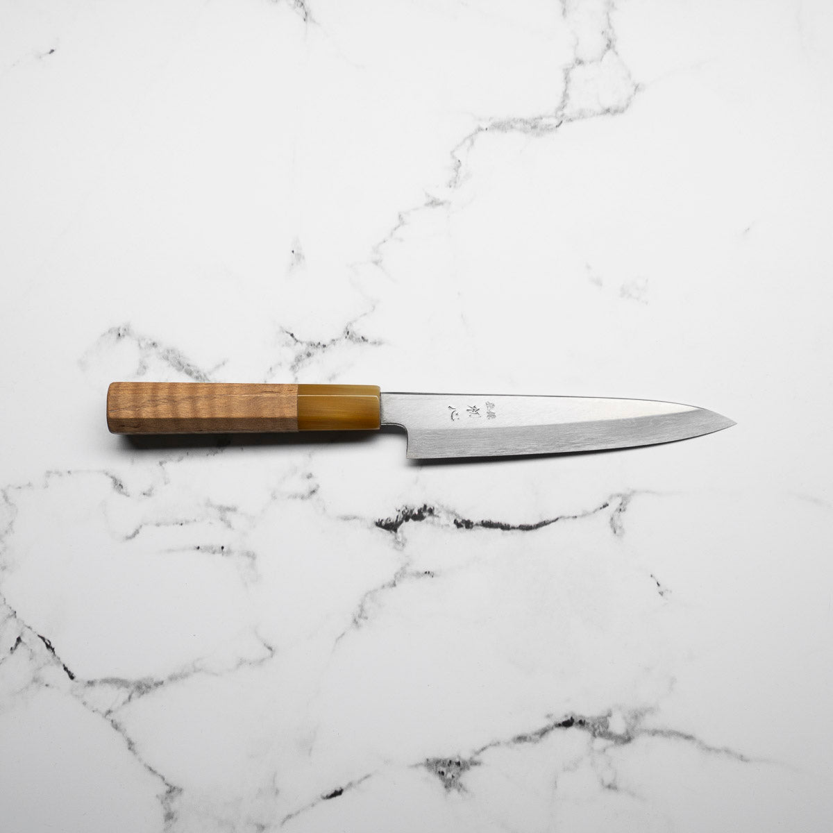 This knife is made from a high-carbon steel and as such, will require a little more care than a regular off-the-shelf knife. It must be dried shortly after use, as prolonged exposure to moisture can cause rust spots to appear. A very light coat of oil during storage also helps to prevent rust spots. A patina (colouration and seasoning of the steel) will occur with use.