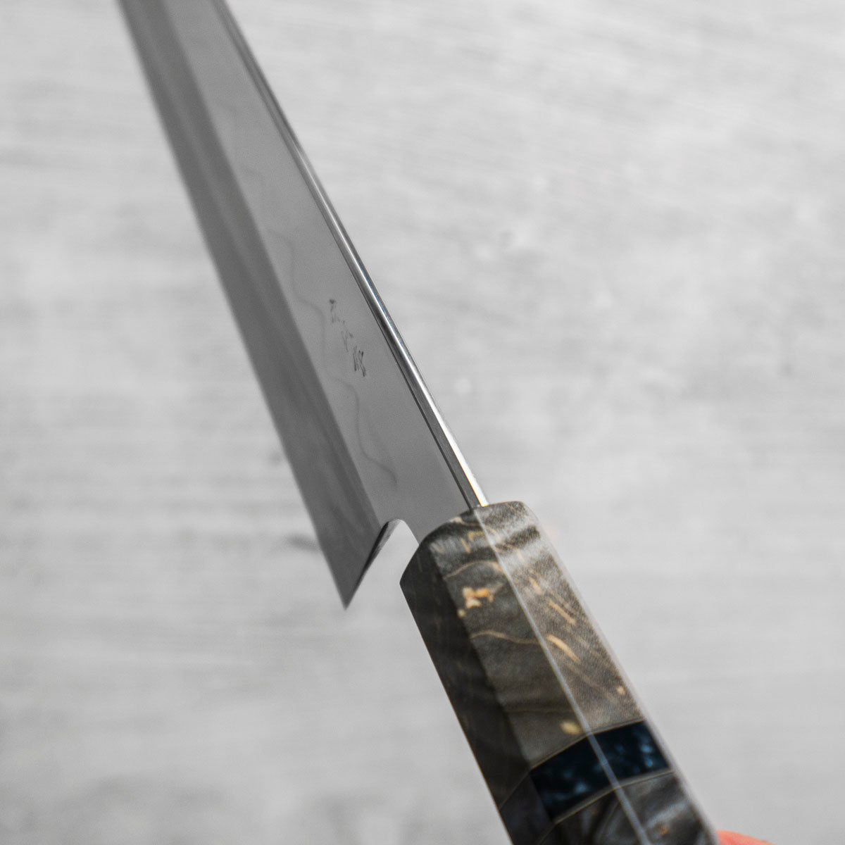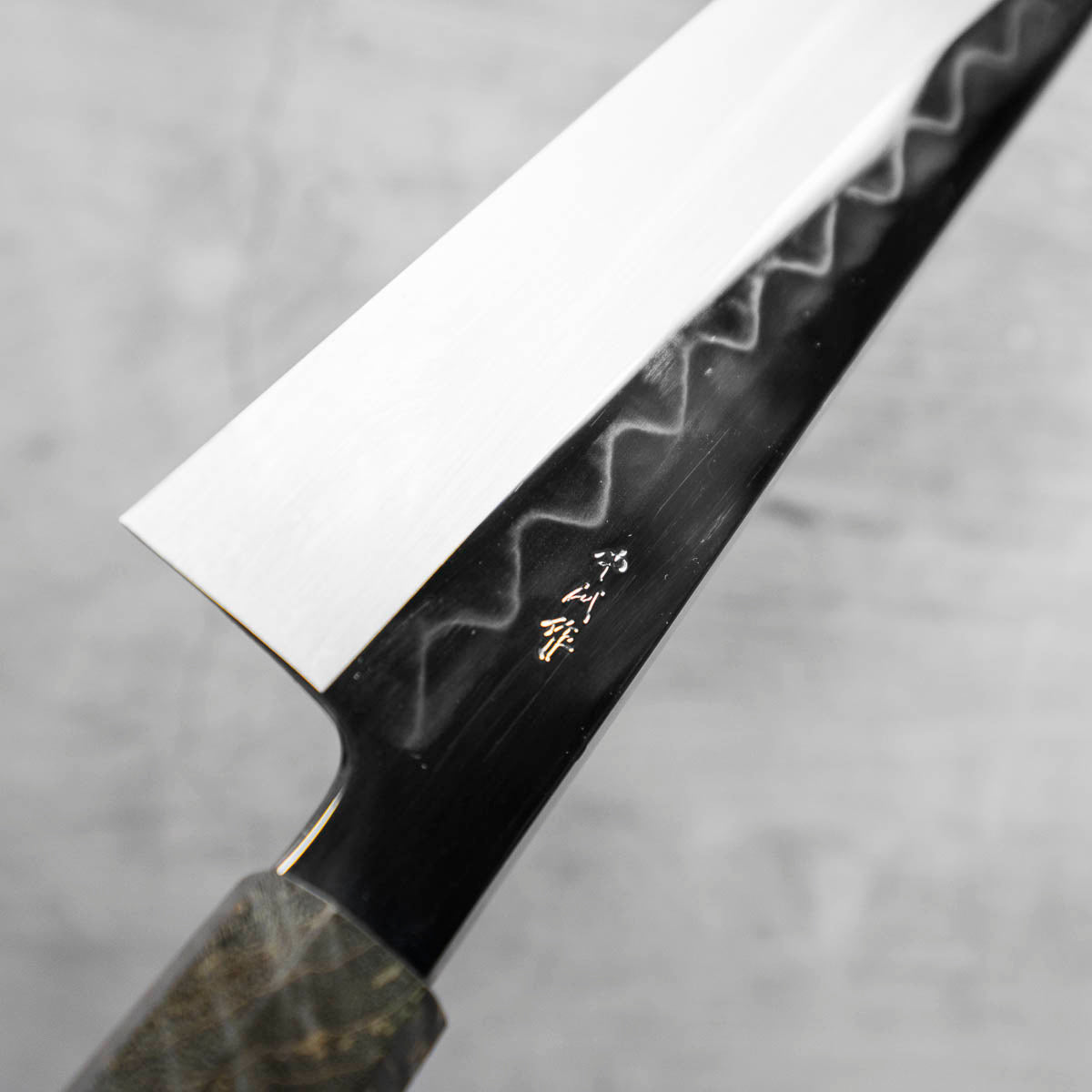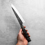 Japanese White Steel #3, a traditional high-carbon steel, is cherished for its purity and fine grain structure, enabling razor-sharp edges, at the cost of being reactive. It is one of the easiest steels to sharpen, but cannot be left wet for even short periods otherwise rust spots can occur. If you’re fastidious in your knife maintenance, this knife steel can be extremely rewarding to use.