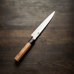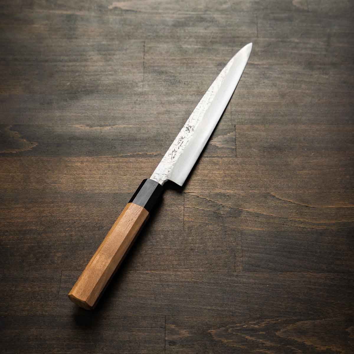 The Yanagiba knife, a staple in traditional Japanese cuisine, is a slender, long-bladed knife primarily used for slicing sashimi and sushi. Its graceful, single-beveled edge guarantees precise, thin cuts, preserving the texture and integrity of the fish. Revered for its sharpness and balance, the Yanagiba is essential for authentic Japanese food preparation.