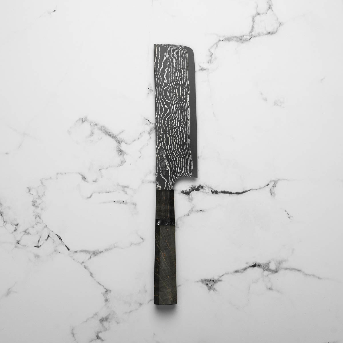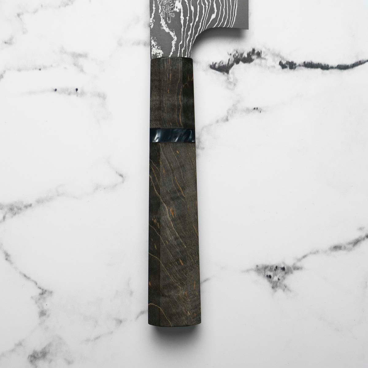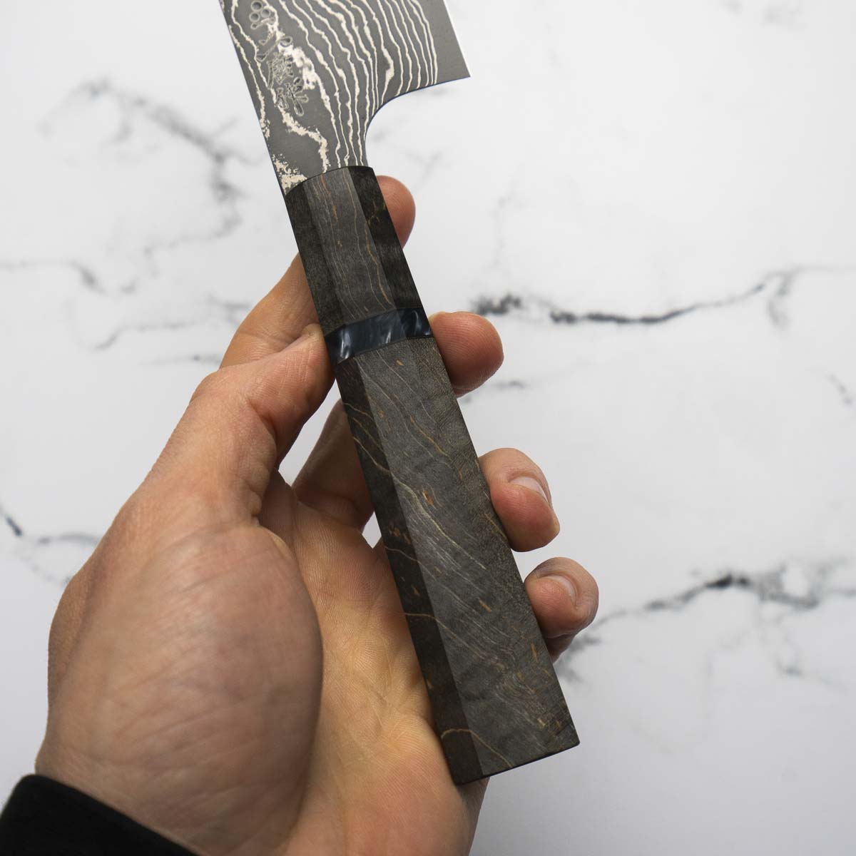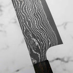 Nigara Hamono are truly some of the most experienced knifemakers in Japan. Now on their 8th generation of blacksmiths, they are masters at stainless damascus forging and heat treatment. The Anmon Damascus we have available have a matte finish and are polished underneath, resulting in a brilliant visual contrast.