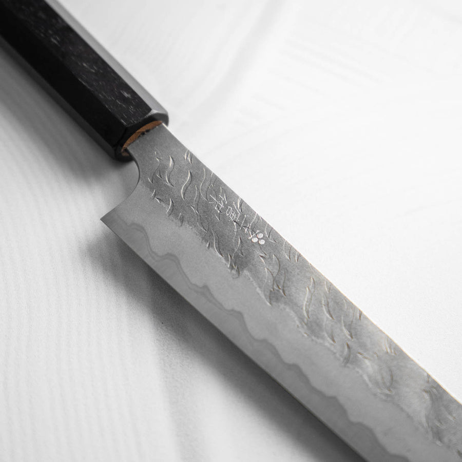 Nigara Hamono are truly some of the most experienced knifemakers in Japan. Now on their 8th generation of blacksmiths, they are masters at stainless damascus forging and heat treatment. The Anmon Damascus we have available have a matte finish and are polished underneath, resulting in a brilliant visual contrast.