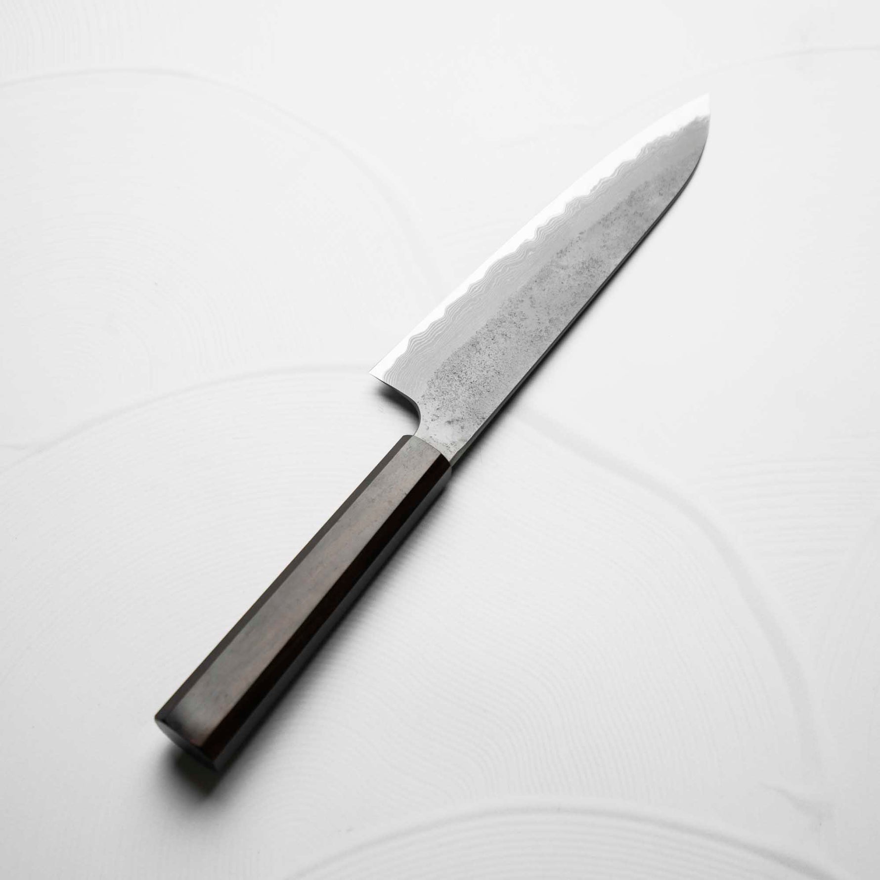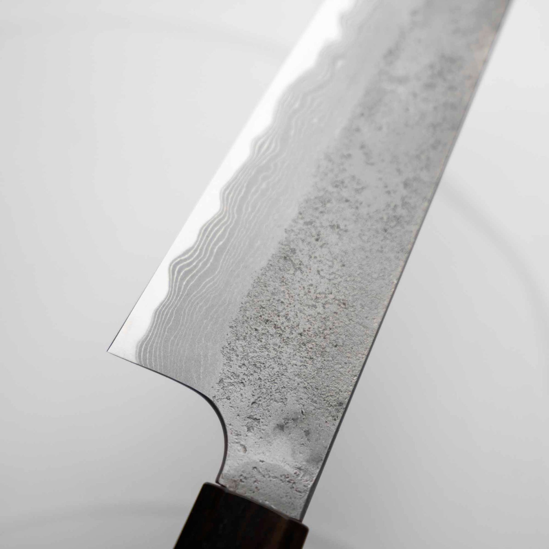 Nigara Hamono are truly some of the most experienced knifemakers in Japan. Now on their 8th generation of blacksmiths, they are masters at stainless damascus forging and heat treatment. The Anmon Damascus we have available have a matte finish and are polished underneath, resulting in a brilliant visual contrast.