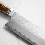 Nigara Hamono are truly some of the most experienced knifemakers in Japan. Now on their 8th generation of blacksmiths, they are masters at stainless damascus forging and heat treatment. The Anmon Damascus we have available have a matte finish and are polished underneath, resulting in a brilliant visual contrast.