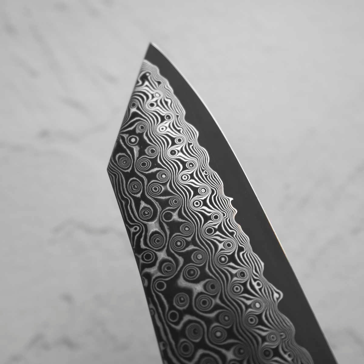 Nigara Hamono are truly some of the most experienced knifemakers in Japan. Now on their 8th generation of blacksmiths, they are masters at stainless damascus forging and heat treatment. The Anmon Damascus we have available have a matte finish and are polished underneath, resulting in a brilliant visual contrast.