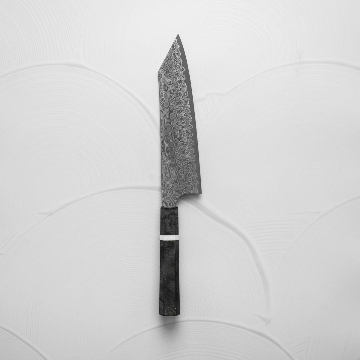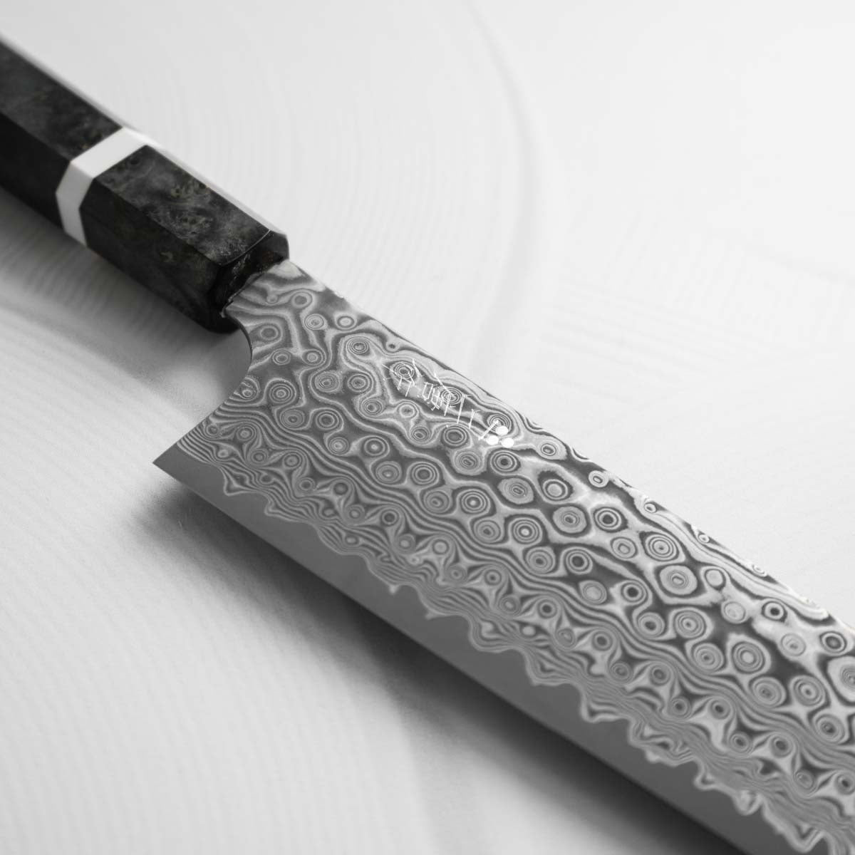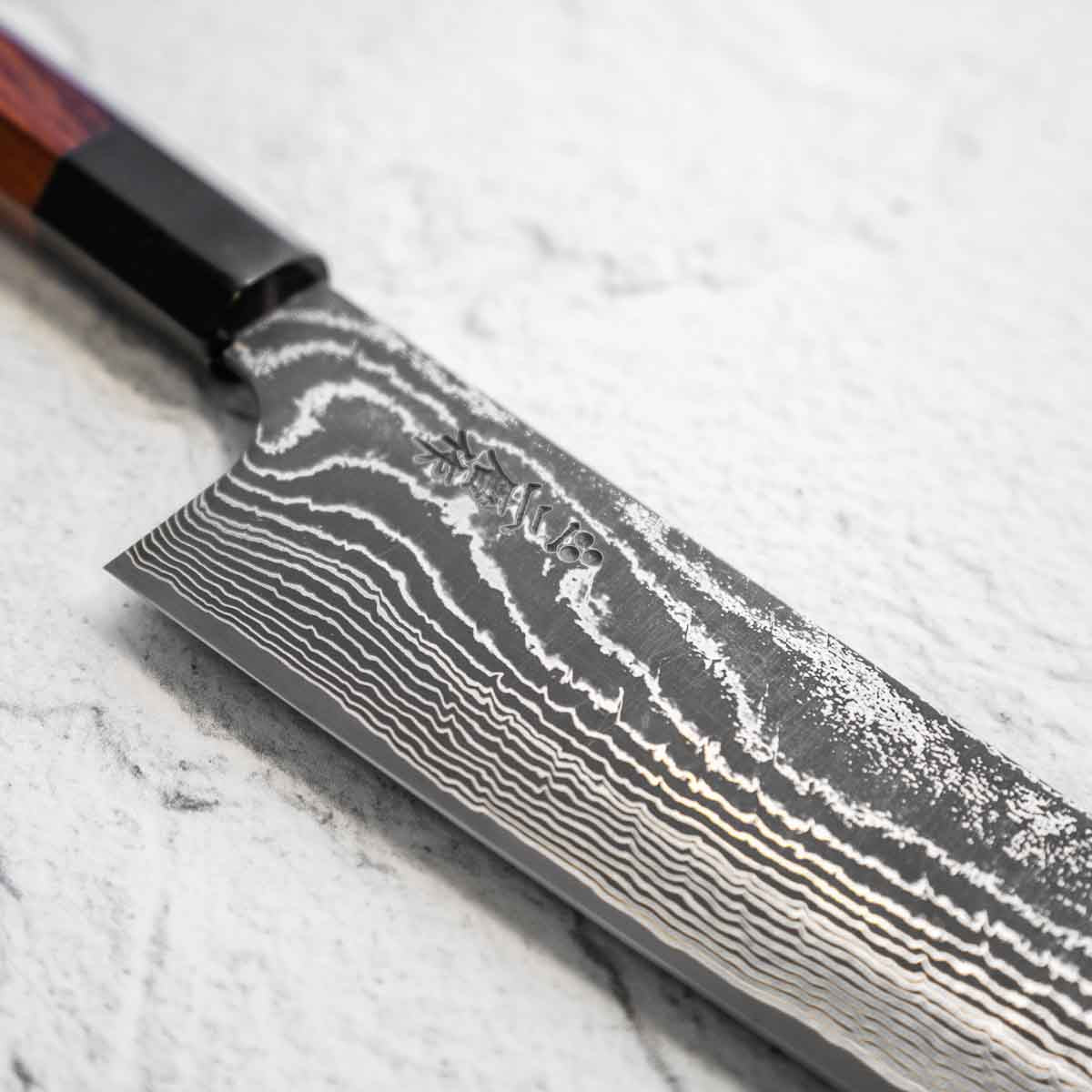 Nigara Hamono are truly some of the most experienced knifemakers in Japan. Now on their 8th generation of blacksmiths, they are masters at stainless damascus forging and heat treatment. The Anmon Damascus we have available have a matte finish and are polished underneath, resulting in a brilliant visual contrast.