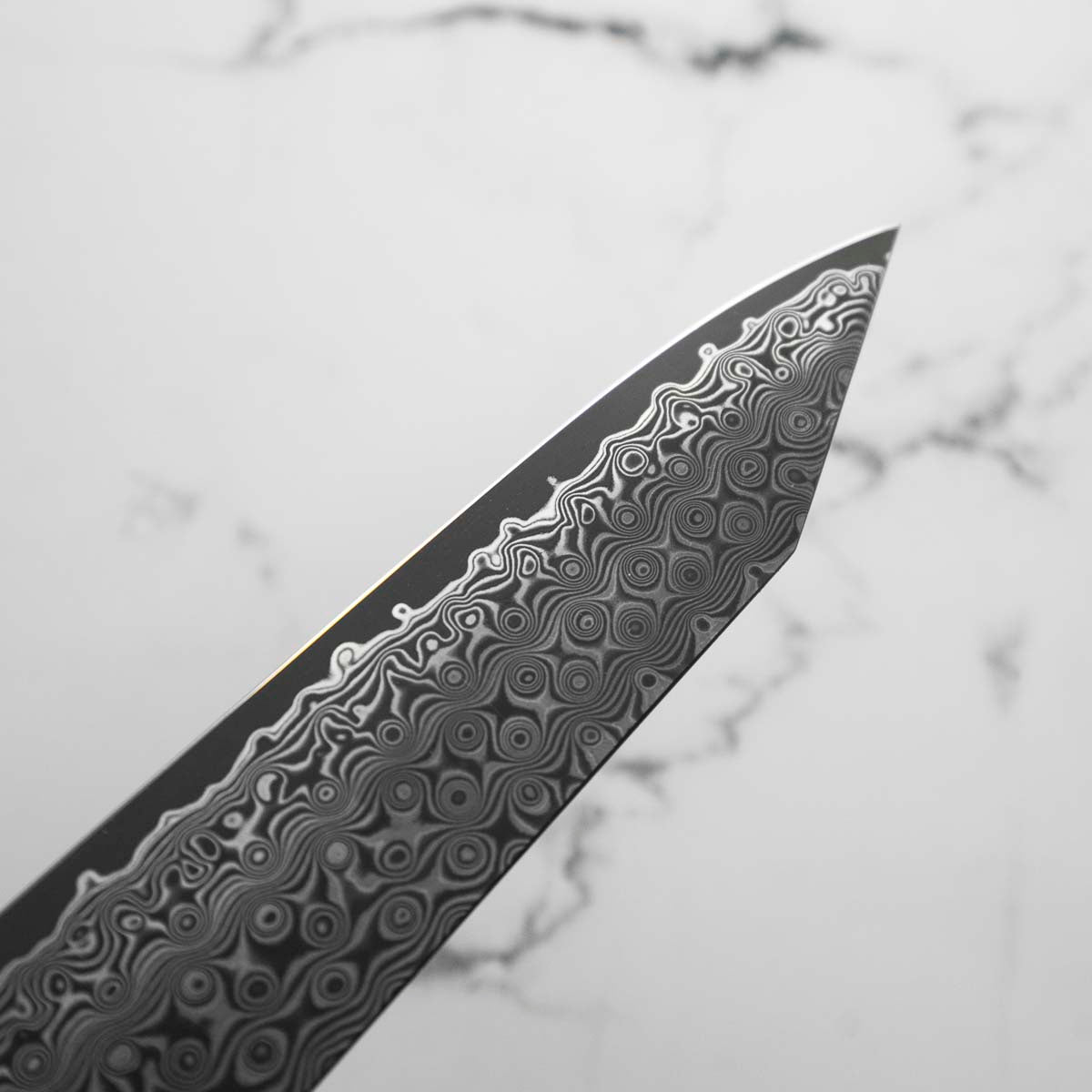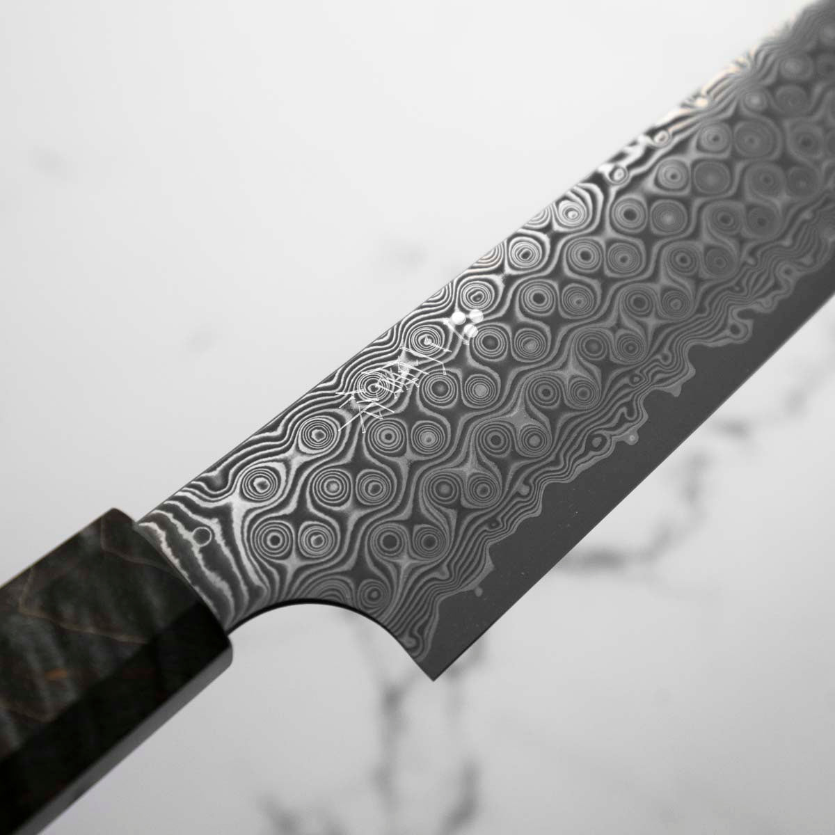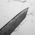 Nigara Hamono are truly some of the most experienced knifemakers in Japan. Now on their 8th generation of blacksmiths, they are masters at stainless damascus forging and heat treatment. The Anmon Damascus we have available have a matte finish and are polished underneath, resulting in a brilliant visual contrast.