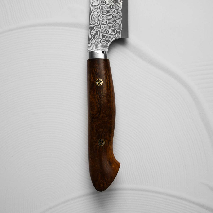 Nigara Hamono are truly some of the most experienced knifemakers in Japan. Now on their 8th generation of blacksmiths, they are masters at stainless damascus forging and heat treatment. The Anmon Damascus we have available have a matte finish and are polished underneath, resulting in a brilliant visual contrast.
