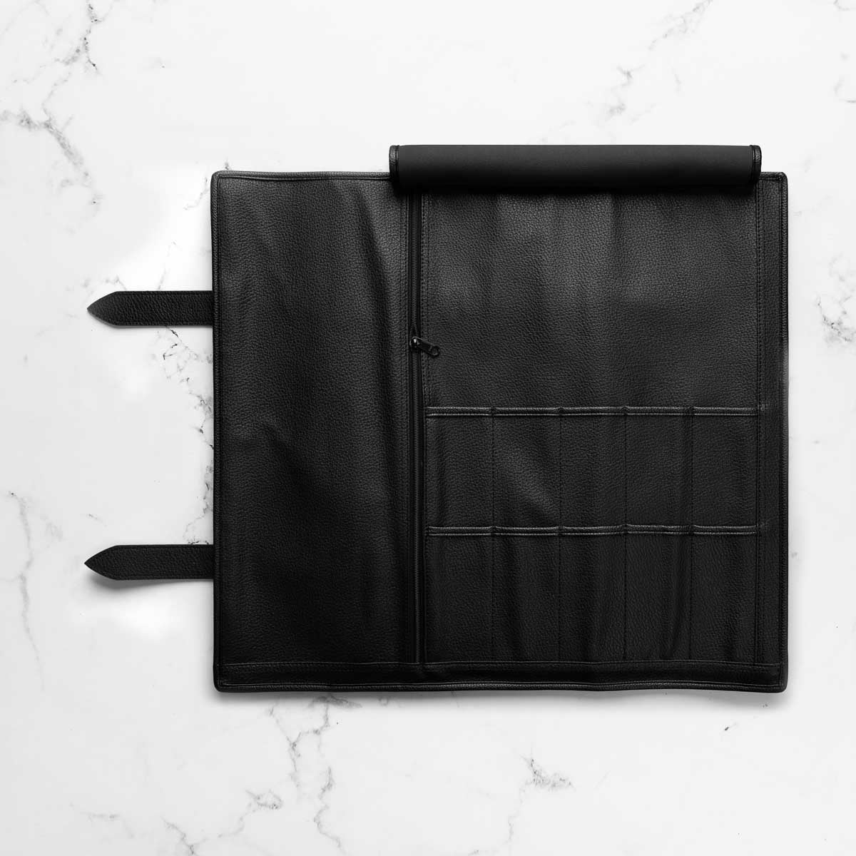 Embark on your culinary journey with the advanced protection of our unique knife roll. Created for both master chefs and aspiring cooks, this roll is distinguished by its practical roll-up design made from supple leather and microfiber and featuring five dedicated knife pockets and 5 additional utility pockets.