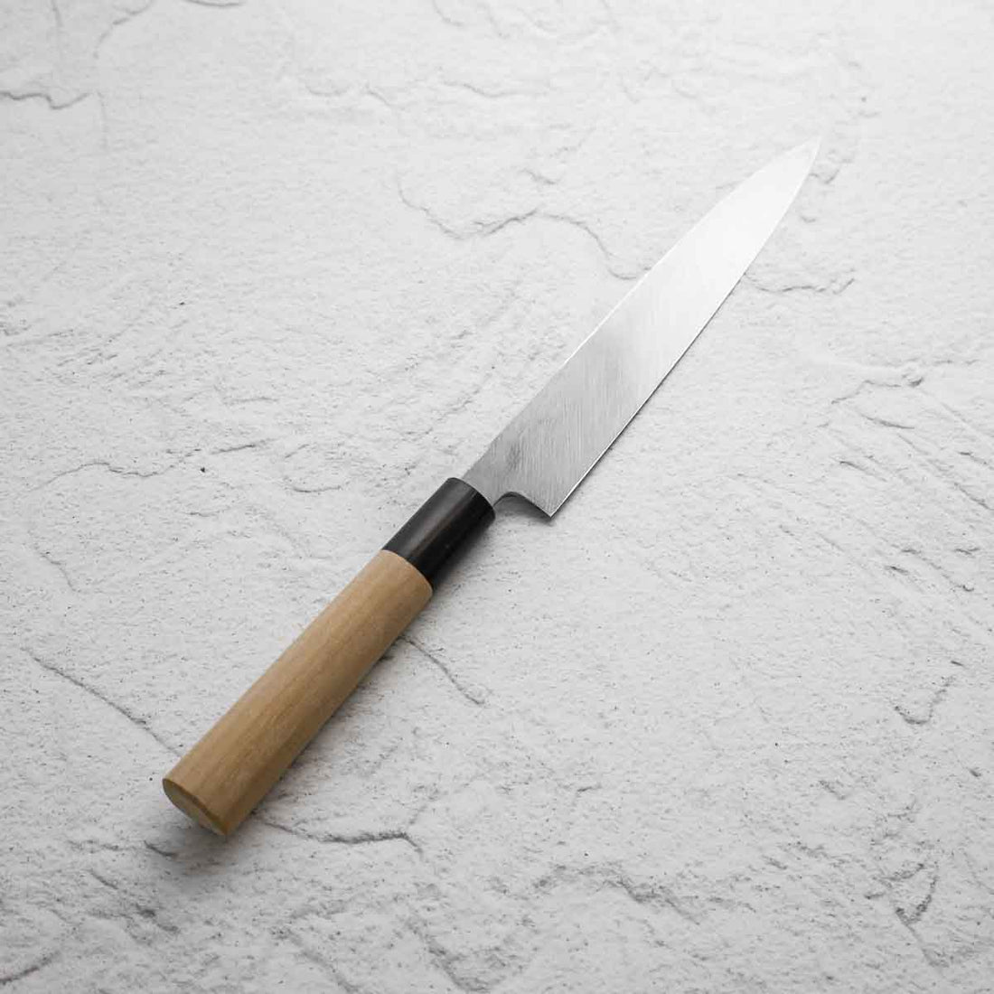 The Yanagiba knife, a staple in traditional Japanese cuisine, is a slender, long-bladed knife primarily used for slicing sashimi and sushi. Its graceful, single-beveled edge guarantees precise, thin cuts, preserving the texture and integrity of the fish. Revered for its sharpness and balance, the Yanagiba is essential for authentic Japanese food preparation.