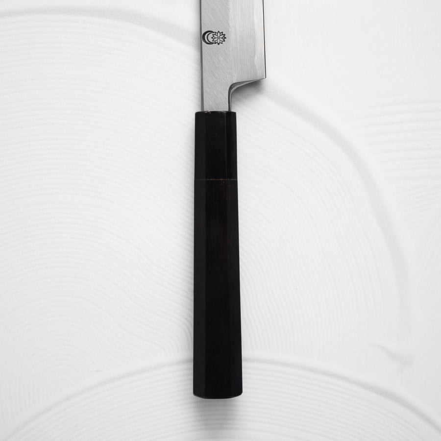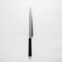 The Yanagiba knife, a staple in traditional Japanese cuisine, is a slender, long-bladed knife primarily used for slicing sashimi and sushi. Its graceful, single-beveled edge guarantees precise, thin cuts, preserving the texture and integrity of the fish. Revered for its sharpness and balance, the Yanagiba is essential for authentic Japanese food preparation.