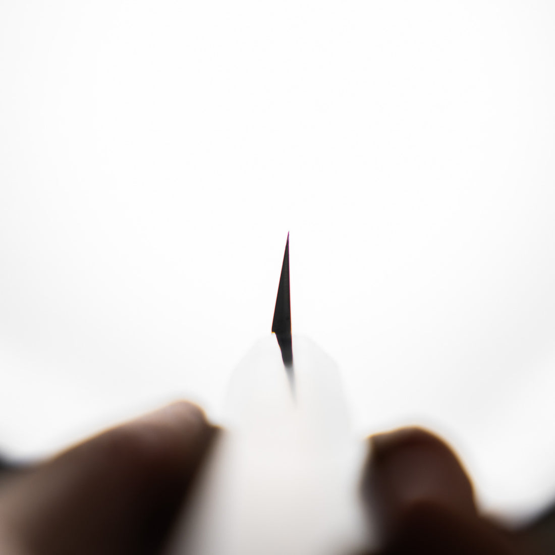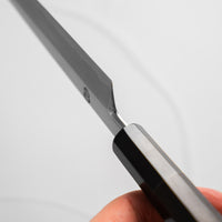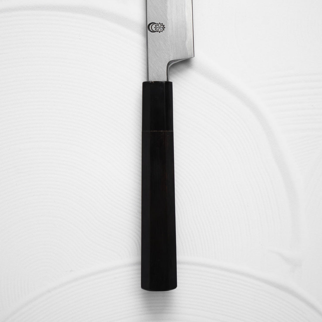 Japanese White Steel #2, a traditional high-carbon steel, is cherished for its purity and fine grain structure, enabling razor-sharp edges, at the cost of being reactive. It is one of the easiest steels to sharpen, but cannot be left wet for even short periods otherwise rust spots can occur. If you’re fastidious in your knife maintenance, this knife can steel can be extremely rewarding to use.