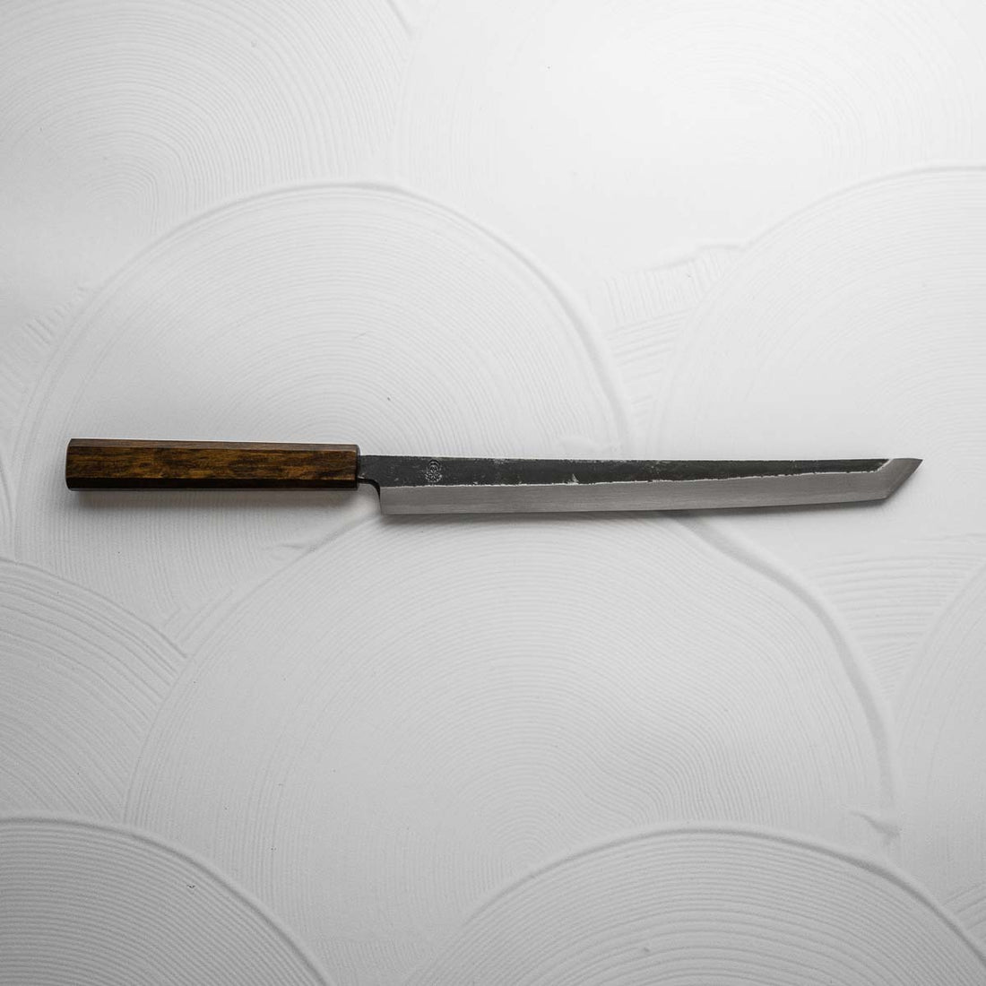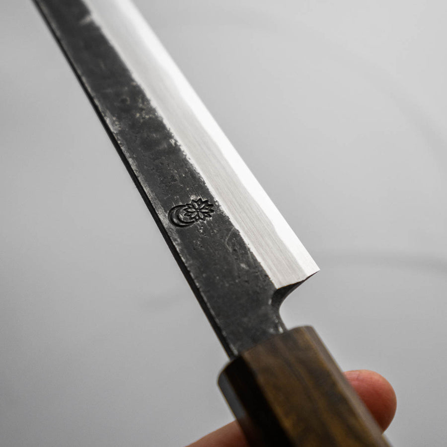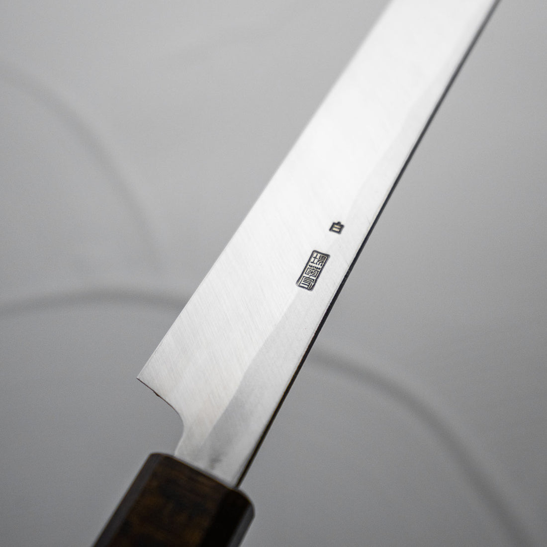 The Sakimaru knife is a specialized Japanese knife, often regarded as a variation of the traditional sashimi knife. It features a long, slender, and gracefully curved blade, designed for making precise, thin cuts of fish, particularly for sashimi. The Sakimaru's elongated shape allows for drawing long, uninterrupted slices, embodying the art of Japanese culinary techniques.