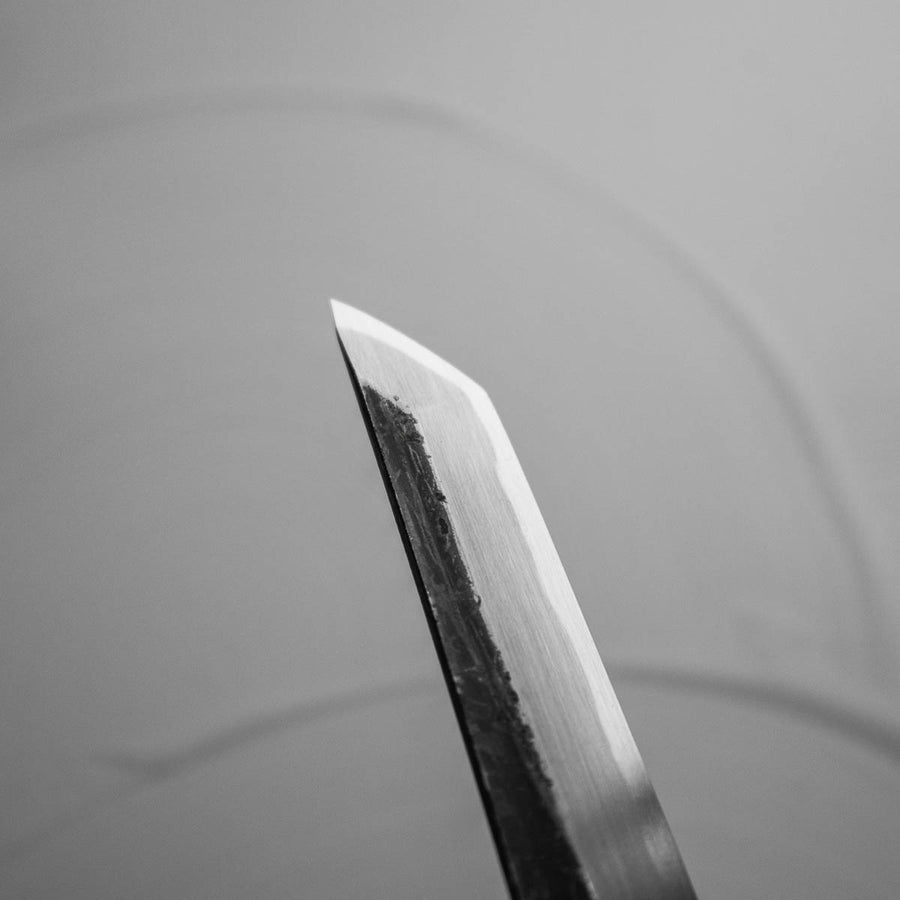 Japanese White Steel #2, a traditional high-carbon steel, is cherished for its purity and fine grain structure, enabling razor-sharp edges, at the cost of being reactive. It is one of the easiest steels to sharpen, but cannot be left wet for even short periods otherwise rust spots can occur. If you’re fastidious in your knife maintenance, this knife can steel can be extremely rewarding to use.