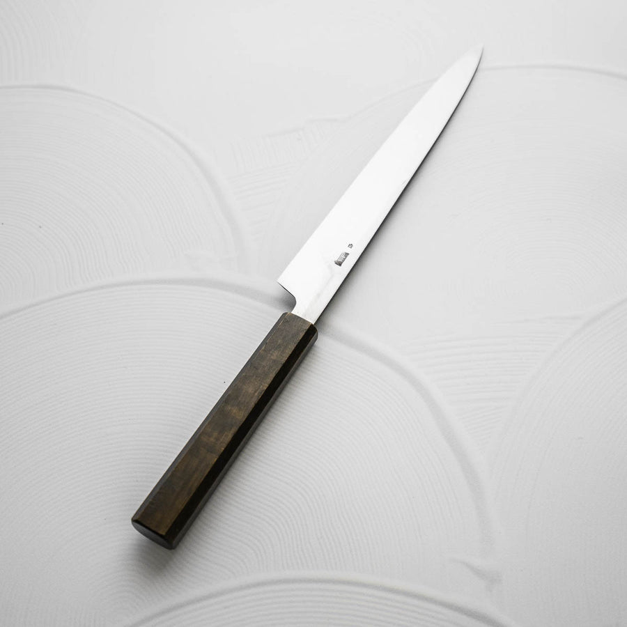 The Yanagiba knife, a staple in traditional Japanese cuisine, is a slender, long-bladed knife primarily used for slicing sashimi and sushi. Its graceful, single-beveled edge guarantees precise, thin cuts, preserving the texture and integrity of the fish. Revered for its sharpness and balance, the Yanagiba is essential for authentic Japanese food preparation.