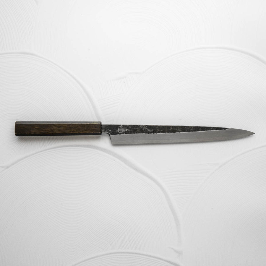 Japanese White Steel #2, a traditional high-carbon steel, is cherished for its purity and fine grain structure, enabling razor-sharp edges, at the cost of being reactive. It is one of the easiest steels to sharpen, but cannot be left wet for even short periods otherwise rust spots can occur. If you’re fastidious in your knife maintenance, this knife can steel can be extremely rewarding to use.