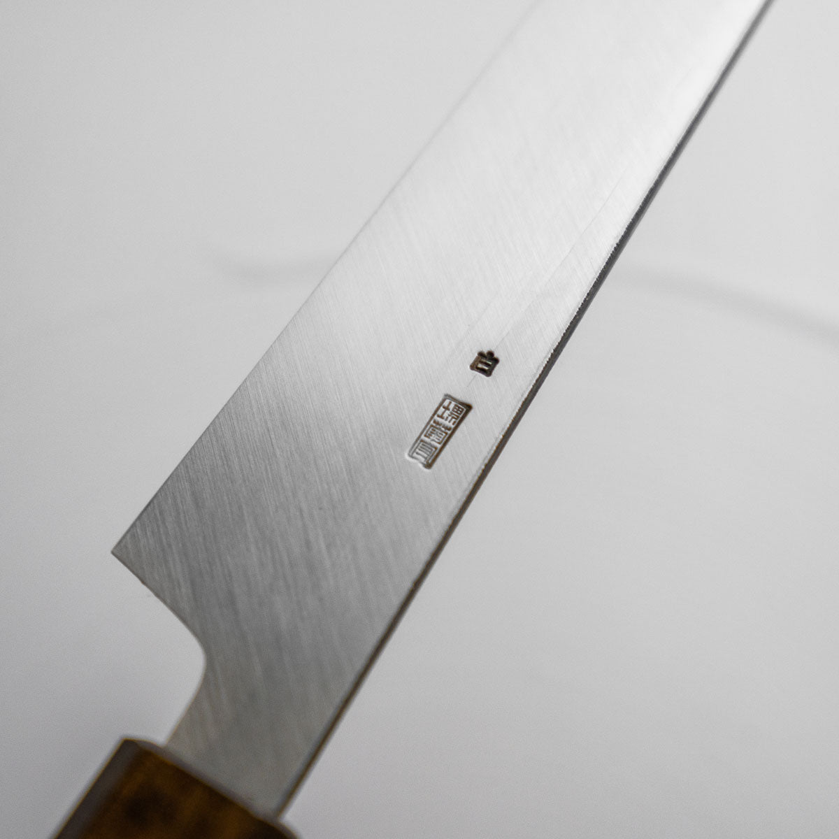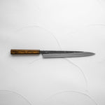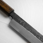 Japanese White Steel #2, a traditional high-carbon steel, is cherished for its purity and fine grain structure, enabling razor-sharp edges, at the cost of being reactive. It is one of the easiest steels to sharpen, but cannot be left wet for even short periods otherwise rust spots can occur. If you’re fastidious in your knife maintenance, this knife can steel can be extremely rewarding to use.