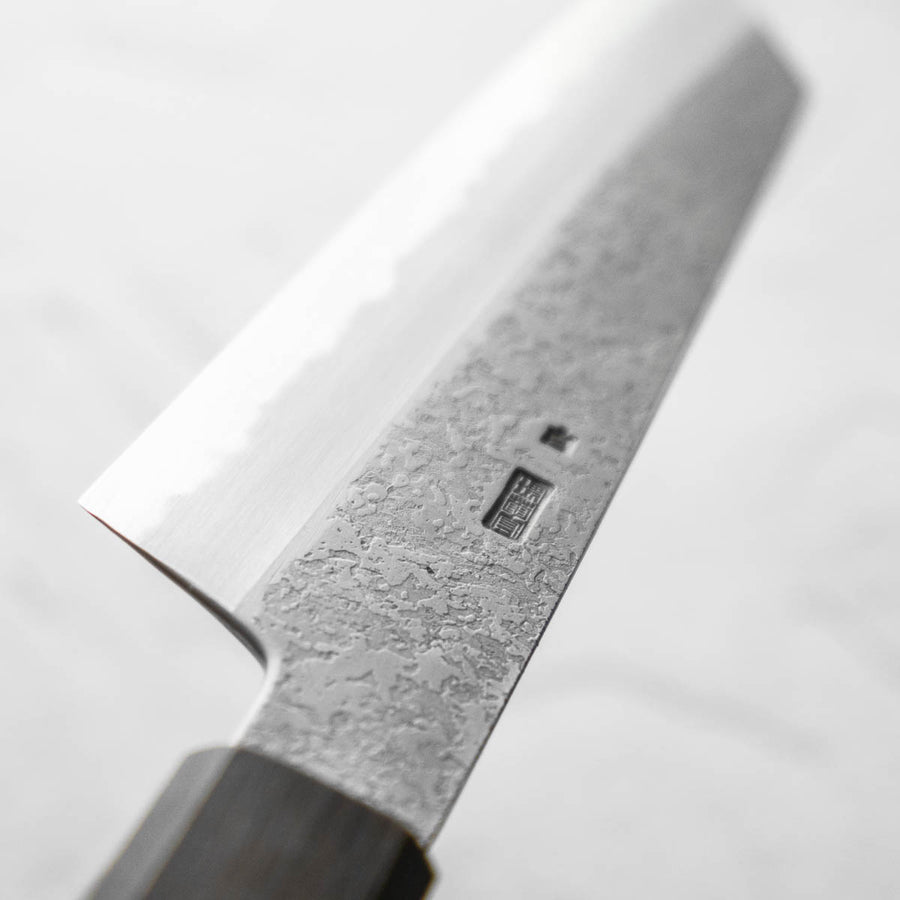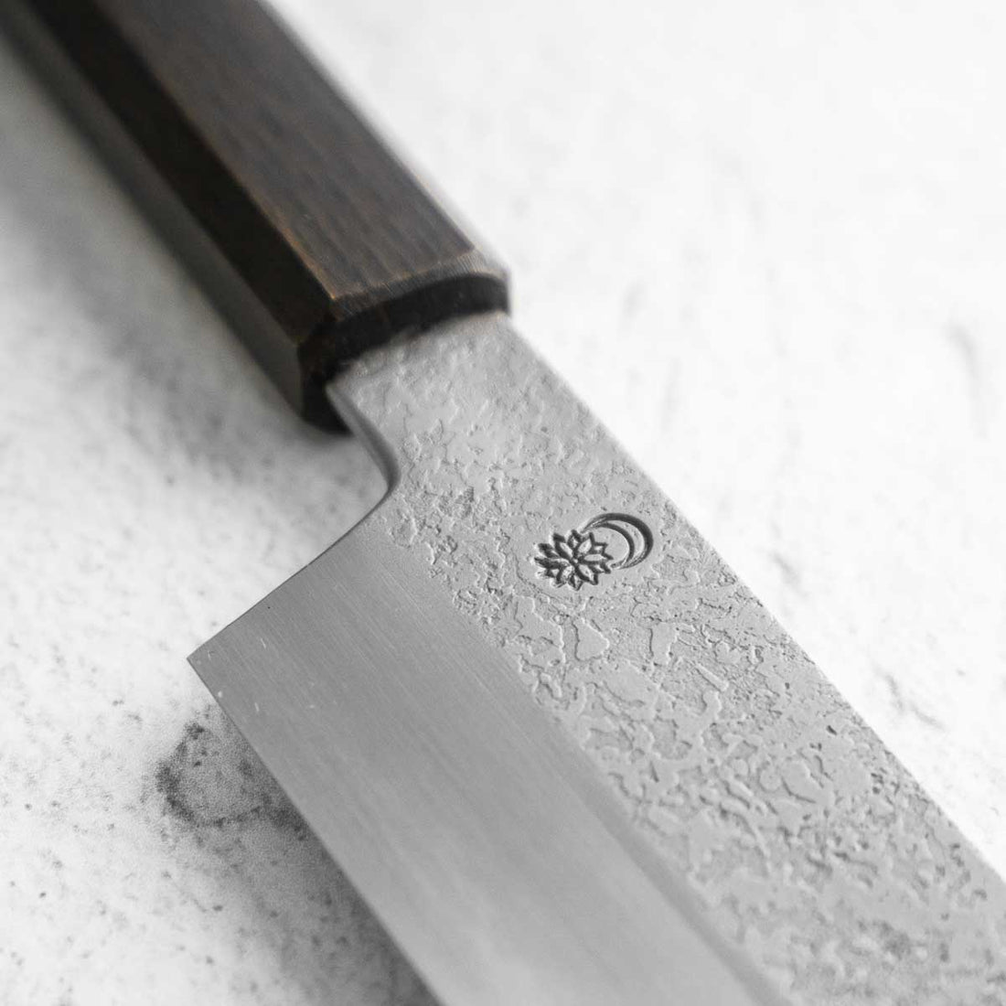 Japanese White Steel #2, a traditional high-carbon steel, is cherished for its purity and fine grain structure, enabling razor-sharp edges, at the cost of being reactive. It is one of the easiest steels to sharpen, but cannot be left wet for even short periods otherwise rust spots can occur. If you’re fastidious in your knife maintenance, this knife can steel can be extremely rewarding to use.