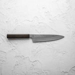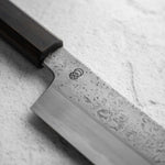 Japanese White Steel #2, a traditional high-carbon steel, is cherished for its purity and fine grain structure, enabling razor-sharp edges, at the cost of being reactive. It is one of the easiest steels to sharpen, but cannot be left wet for even short periods otherwise rust spots can occur. If you’re fastidious in your knife maintenance, this knife can steel can be extremely rewarding to use.