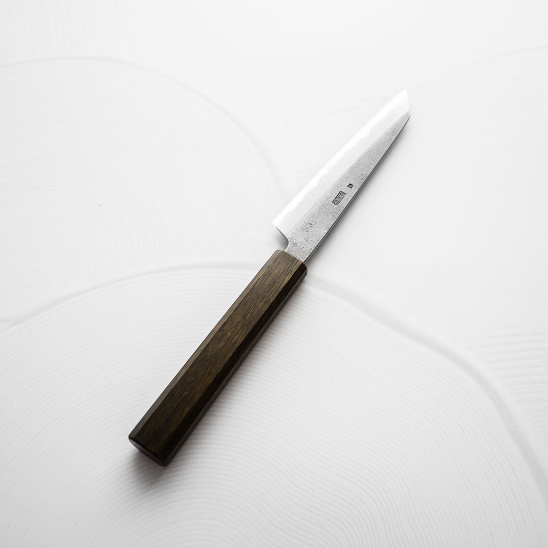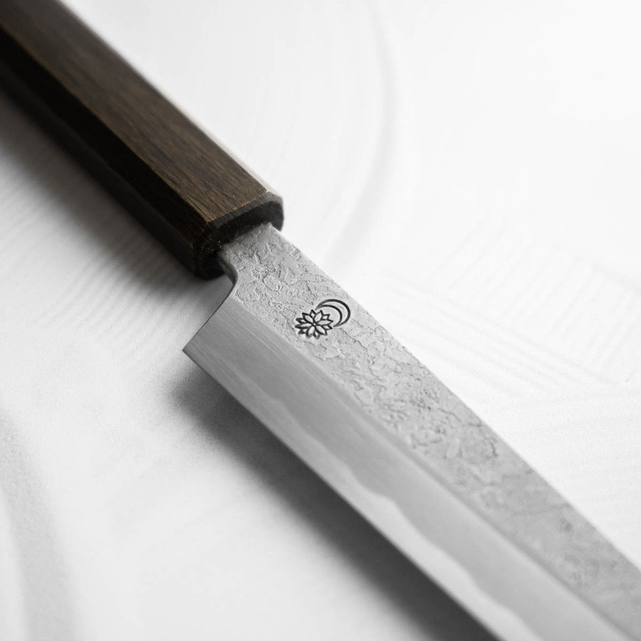 Japanese White Steel #2, a traditional high-carbon steel, is cherished for its purity and fine grain structure, enabling razor-sharp edges, at the cost of being reactive. It is one of the easiest steels to sharpen, but cannot be left wet for even short periods otherwise rust spots can occur. If you’re fastidious in your knife maintenance, this knife can steel can be extremely rewarding to use.