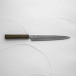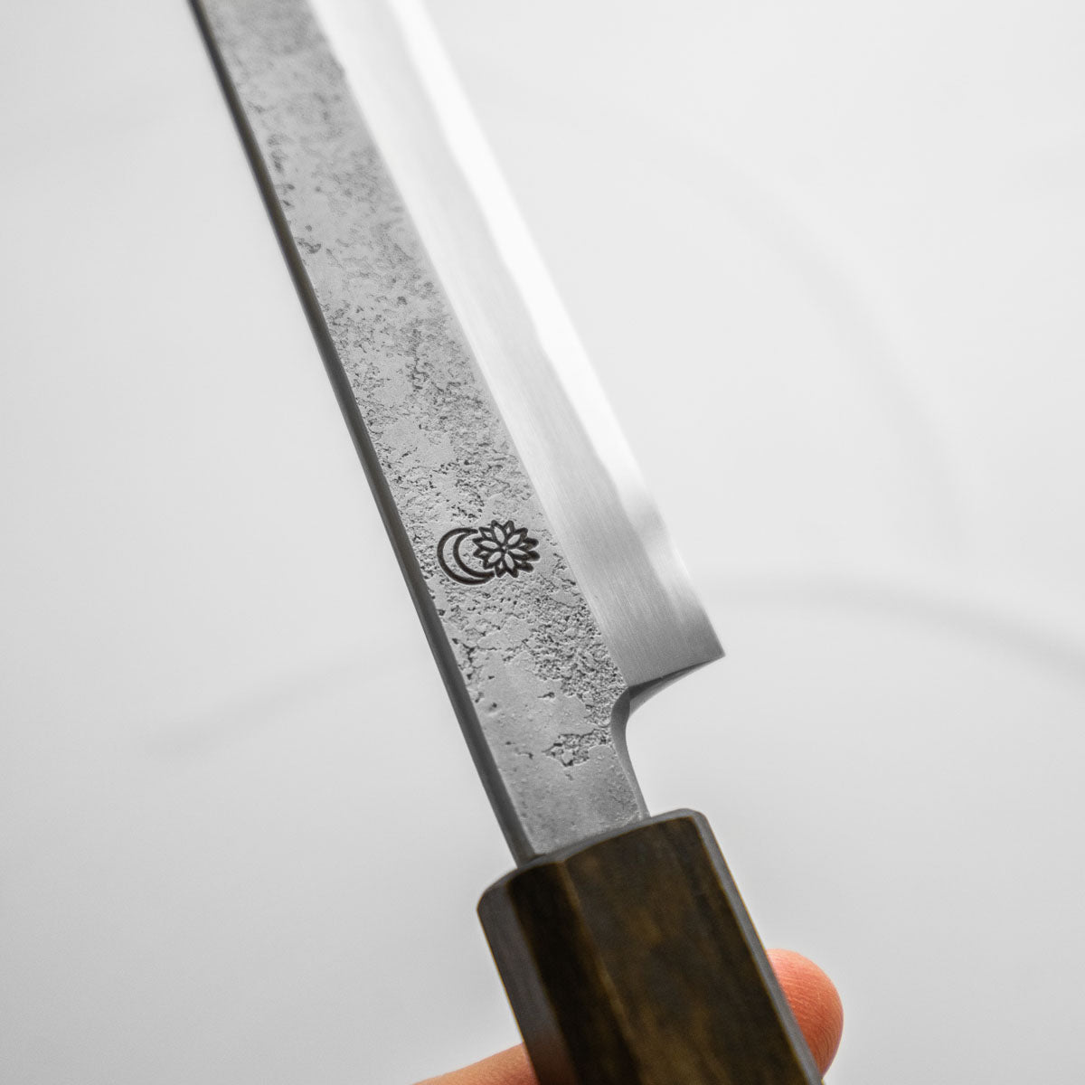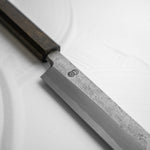 Japanese White Steel #2, a traditional high-carbon steel, is cherished for its purity and fine grain structure, enabling razor-sharp edges, at the cost of being reactive. It is one of the easiest steels to sharpen, but cannot be left wet for even short periods otherwise rust spots can occur. If you’re fastidious in your knife maintenance, this knife can steel can be extremely rewarding to use.