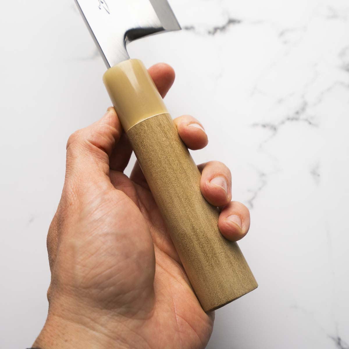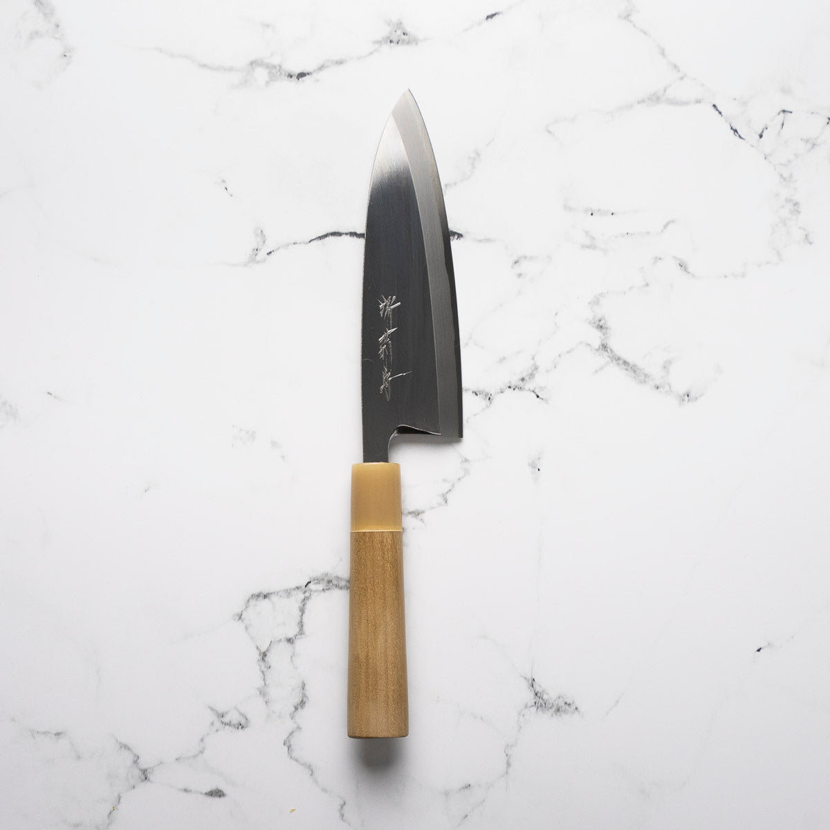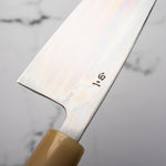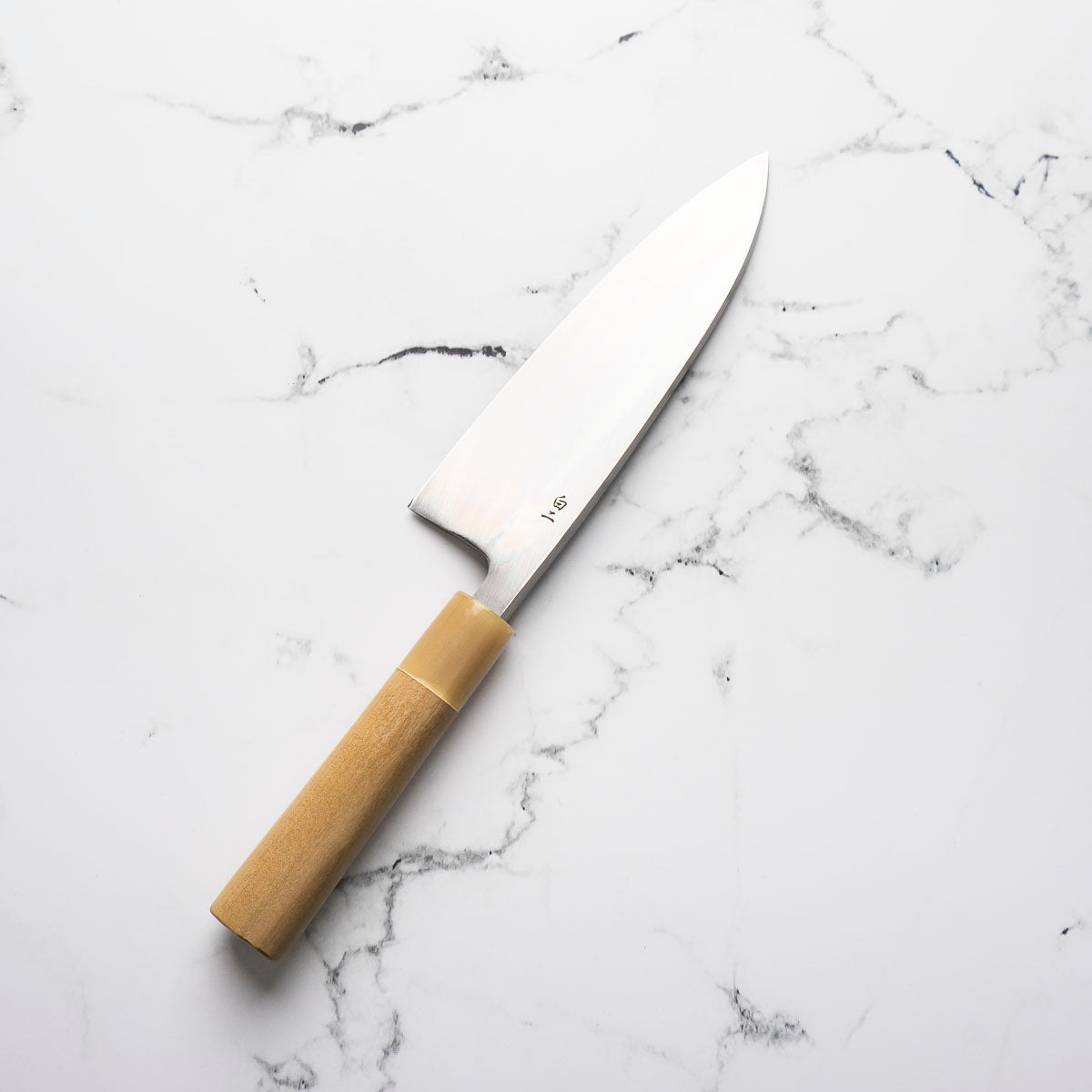 Japanese White Steel #2, a traditional high-carbon steel, is cherished for its purity and fine grain structure, enabling razor-sharp edges, at the cost of being reactive. It is one of the easiest steels to sharpen, but cannot be left wet for even short periods otherwise rust spots can occur. If you’re fastidious in your knife maintenance, this knife can steel can be extremely rewarding to use.