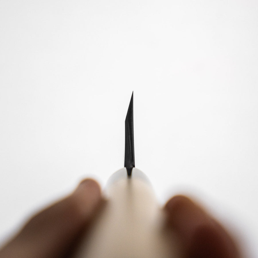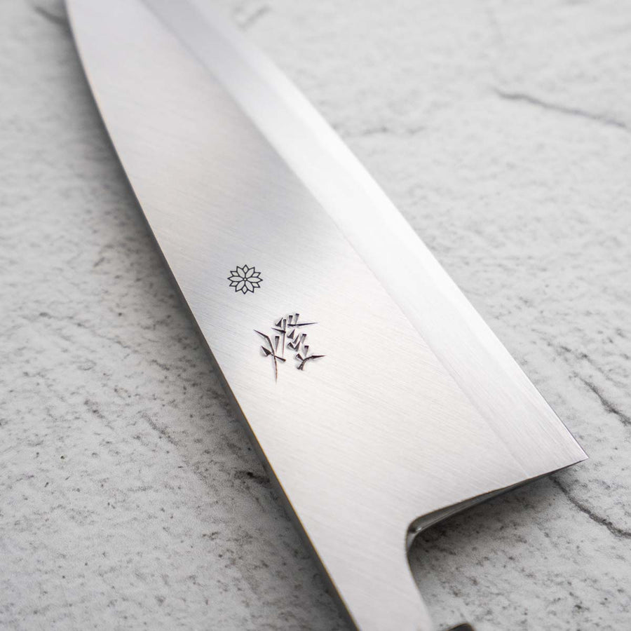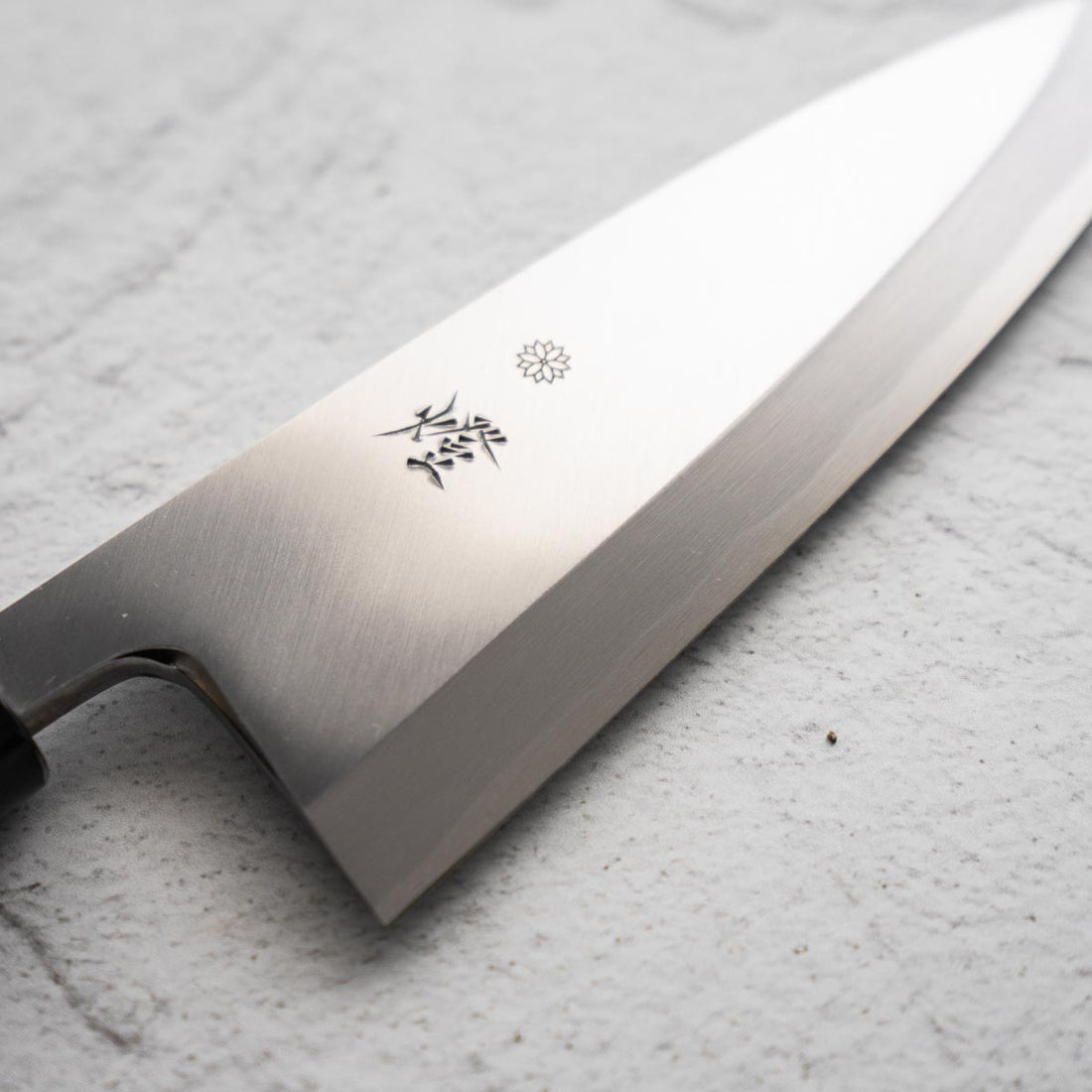 Japanese White Steel #2, a traditional high-carbon steel, is cherished for its purity and fine grain structure, enabling razor-sharp edges, at the cost of being reactive. It is one of the easiest steels to sharpen, but cannot be left wet for even short periods otherwise rust spots can occur. If you’re fastidious in your knife maintenance, this knife can steel can be extremely rewarding to use.
