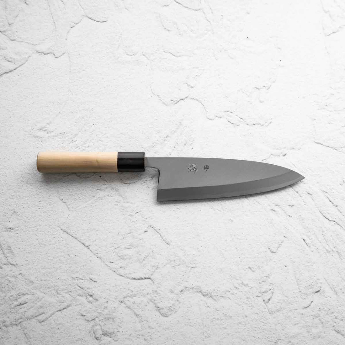 The Deba knife, deeply rooted in Japanese culinary tradition, is a robust, single-bevel knife (sometimes double) primarily designed for fileting fish. Its thick, heavy blade effortlessly glides through fish bones and joints, while preserving delicate flesh. Ideal for seafood preparation, the Deba is a staple in Japanese kitchens for its precision and strength.