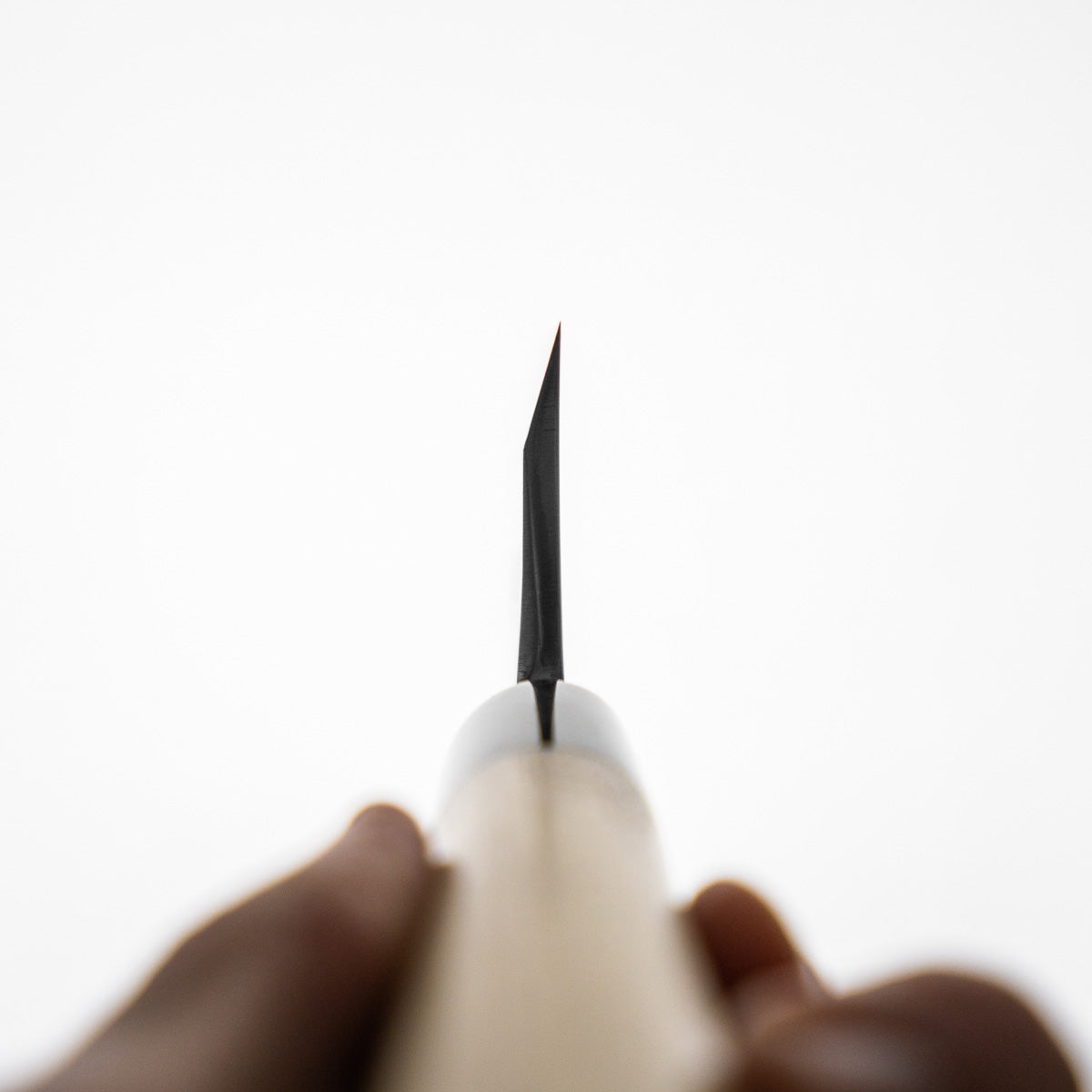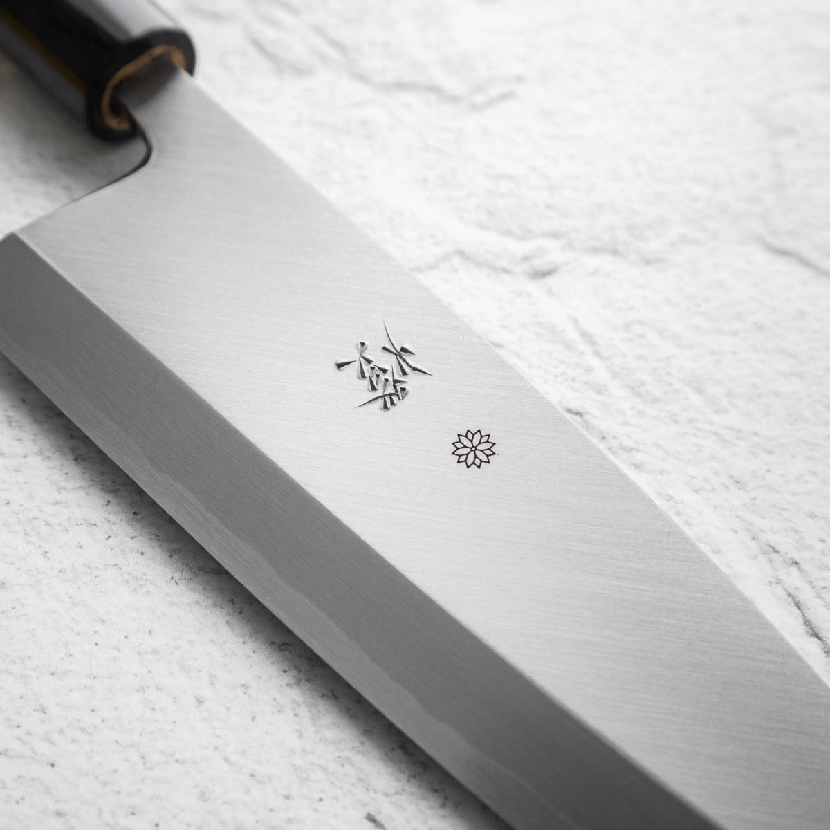 Japanese White Steel #2, a traditional high-carbon steel, is cherished for its purity and fine grain structure, enabling razor-sharp edges, at the cost of being reactive. It is one of the easiest steels to sharpen, but cannot be left wet for even short periods otherwise rust spots can occur. If you’re fastidious in your knife maintenance, this knife can steel can be extremely rewarding to use.