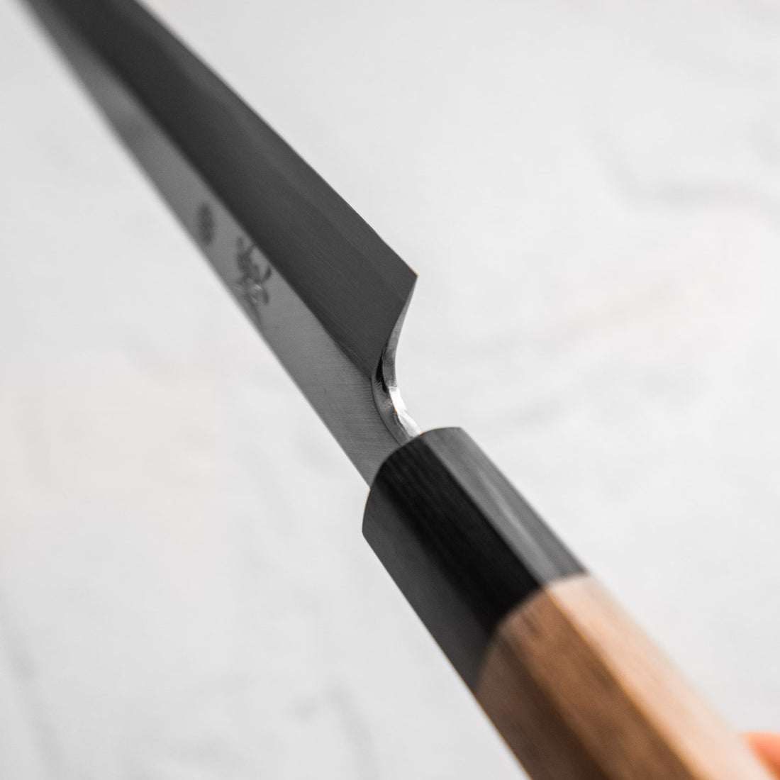 Japanese White Steel #2, a traditional high-carbon steel, is cherished for its purity and fine grain structure, enabling razor-sharp edges, at the cost of being reactive. It is one of the easiest steels to sharpen, but cannot be left wet for even short periods otherwise rust spots can occur. If you’re fastidious in your knife maintenance, this knife can steel can be extremely rewarding to use.