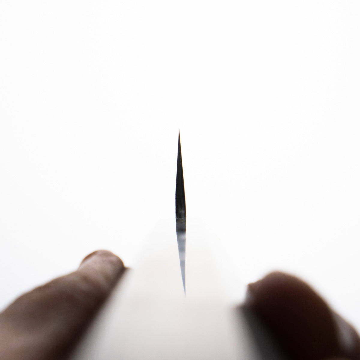 Japanese White Steel #2, a traditional high-carbon steel, is cherished for its purity and fine grain structure, enabling razor-sharp edges, at the cost of being reactive. It is one of the easiest steels to sharpen, but cannot be left wet for even short periods otherwise rust spots can occur. If you’re fastidious in your knife maintenance, this knife steel can be extremely rewarding to use.