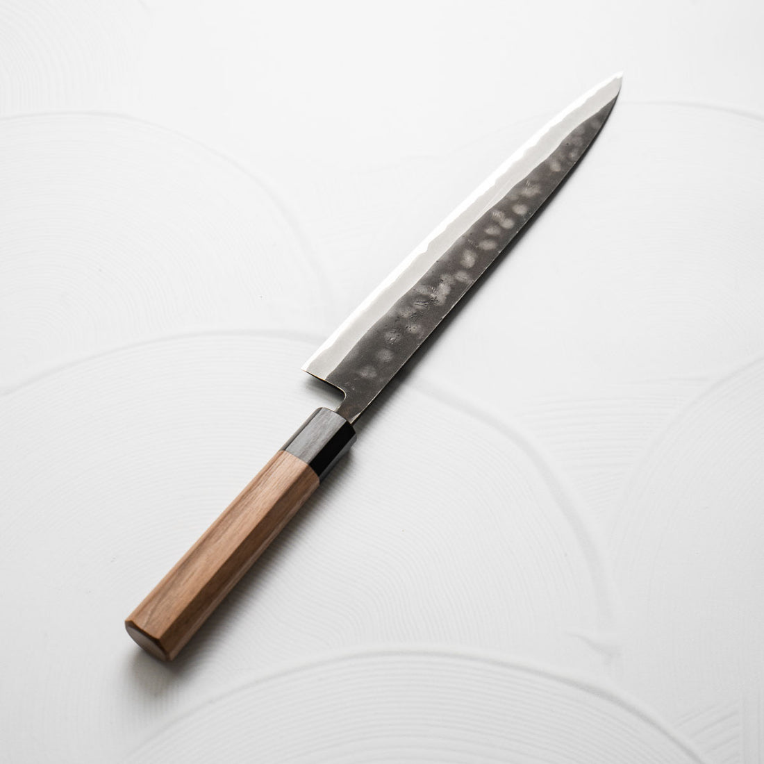 The Sujihiki knife, a traditional Japanese slicer, is designed for carving and fileting. With its long, narrow blade, typically ranging from 240mm to 330mm, it excels in creating clean, smooth cuts through meat and fish. Its length ensures long, uninterrupted strokes, making it perfect for precise slicing tasks.