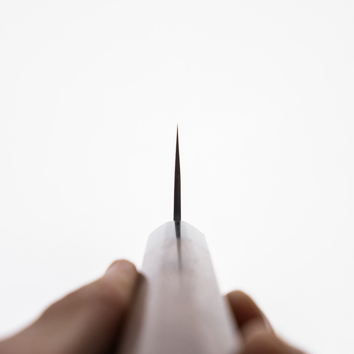 Japanese White Steel #2, a traditional high-carbon steel, is cherished for its purity and fine grain structure, enabling razor-sharp edges, at the cost of being reactive. It is one of the easiest steels to sharpen, but cannot be left wet for even short periods otherwise rust spots can occur. If you’re fastidious in your knife maintenance, this knife steel can be extremely rewarding to use.