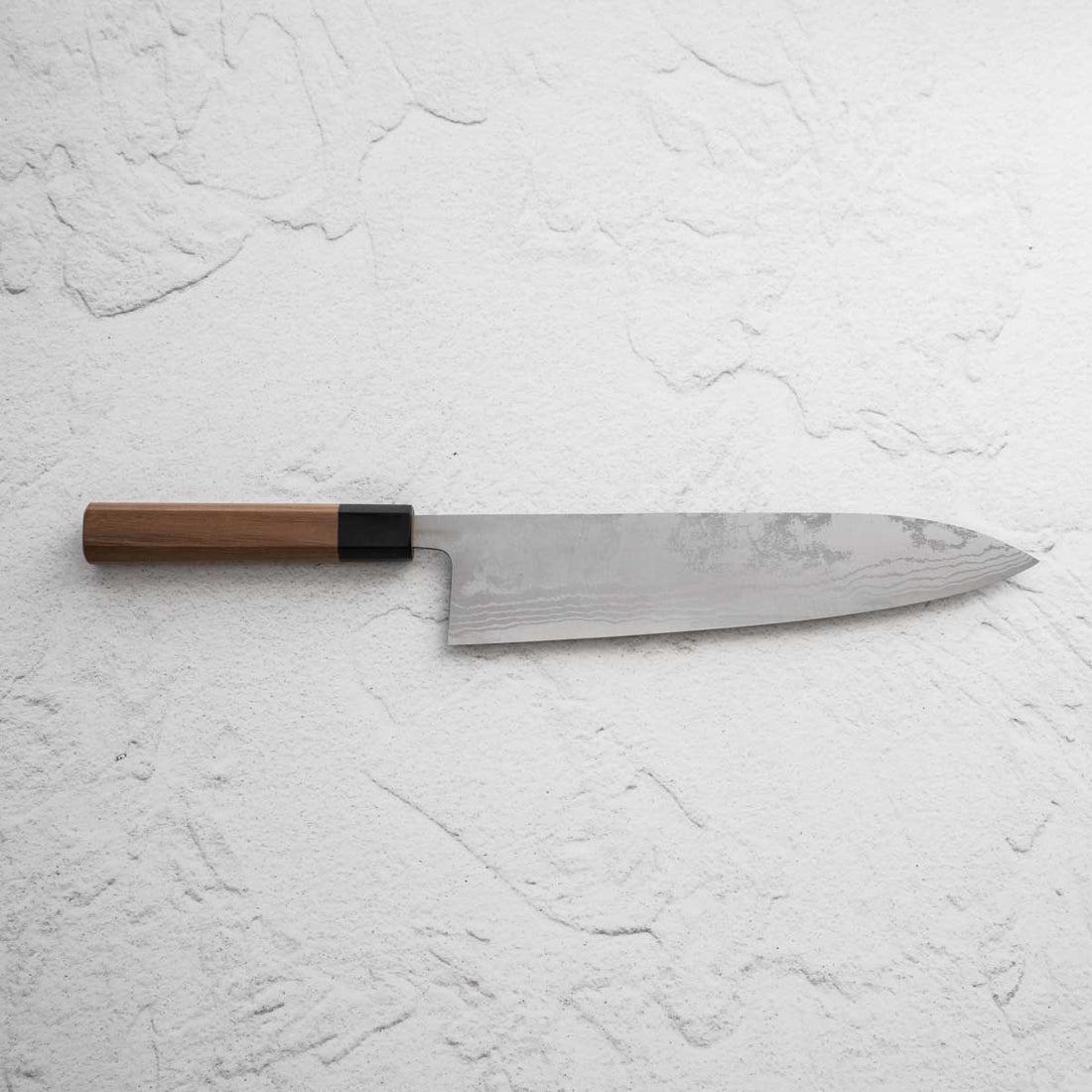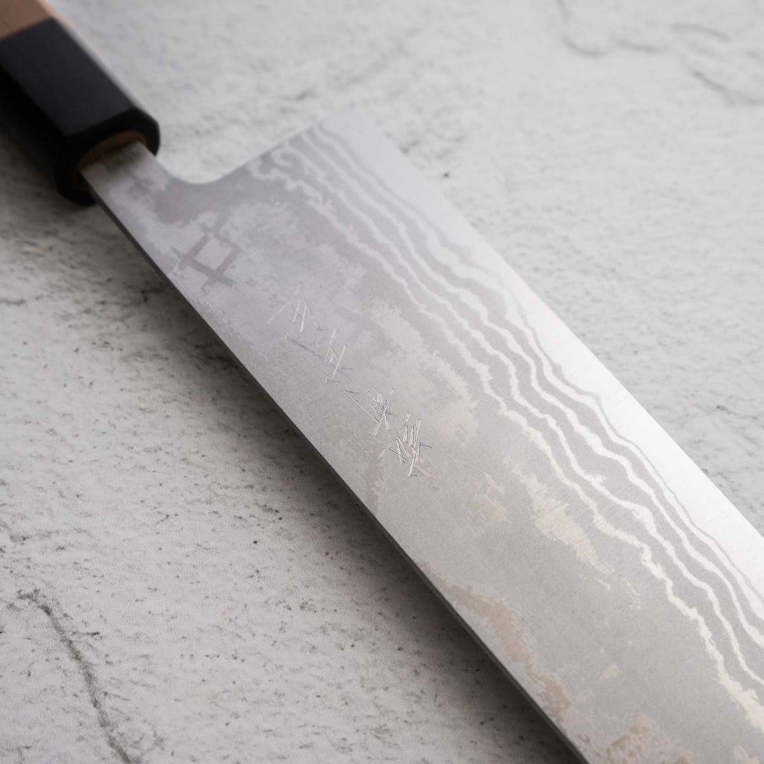 Japanese White Steel #2, a traditional high-carbon steel, is cherished for its purity and fine grain structure, enabling razor-sharp edges, at the cost of being reactive. It is one of the easiest steels to sharpen, but cannot be left wet for even short periods otherwise rust spots can occur. If you’re fastidious in your knife maintenance, this knife steel can be extremely rewarding to use.