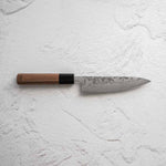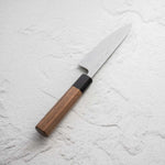 The Petty knife, a quintessential tool in Japanese cuisine, is a smaller utility knife used for precise, delicate tasks. Often considered a smaller sibling to the chef's knife, it excels in hand-held tasks like peeling, trimming, and intricate cutting. Its versatility makes it an essential for detailed culinary work.