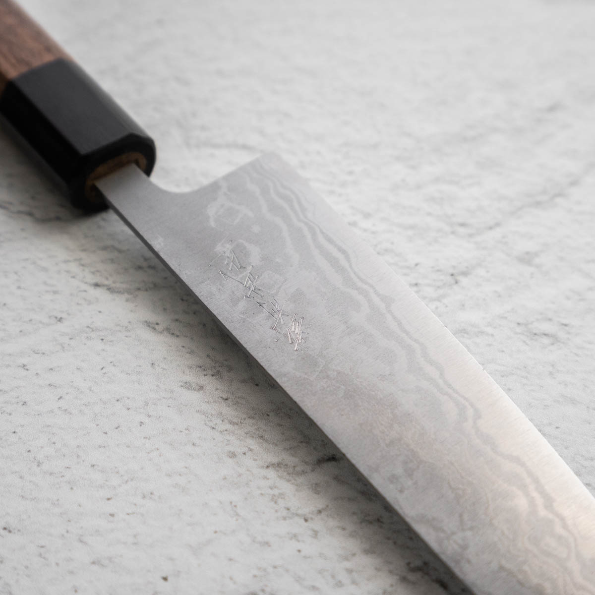 Japanese White Steel #2, a traditional high-carbon steel, is cherished for its purity and fine grain structure, enabling razor-sharp edges, at the cost of being reactive. It is one of the easiest steels to sharpen, but cannot be left wet for even short periods otherwise rust spots can occur. If you’re fastidious in your knife maintenance, this knife steel can be extremely rewarding to use.