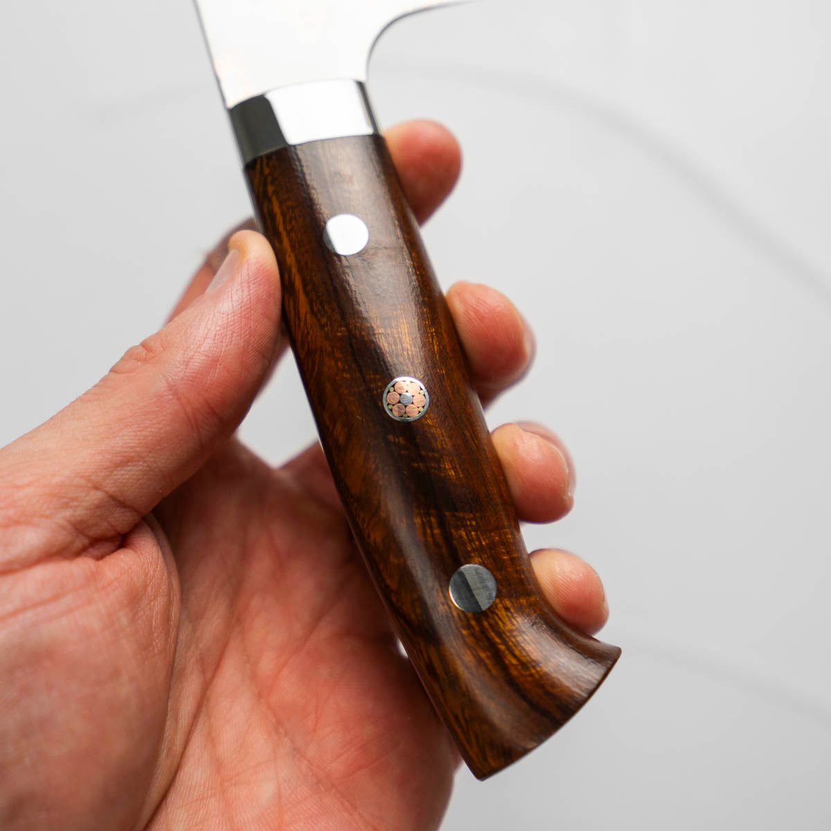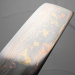 He works across a wide spectrum of steels, from classic Japanese carbon steels to advanced stainless alloys like R2 and VG10. His signature Damascus finishes — including Rainbow, Diamond, and Black Nickel — are unmistakable, and are often paired with an eclectic range of handle styles that reflect both innovation and deep respect for materials.
