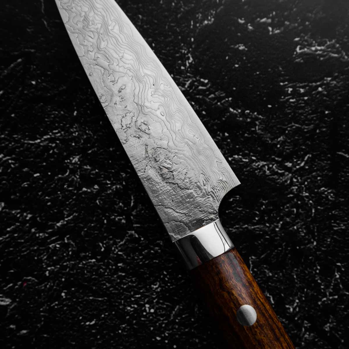 He works across a wide spectrum of steels, from classic Japanese carbon steels to advanced stainless alloys like R2 and VG10. His signature Damascus finishes — including Rainbow, Diamond, and Black Nickel — are unmistakable, and are often paired with an eclectic range of handle styles that reflect both innovation and deep respect for materials.