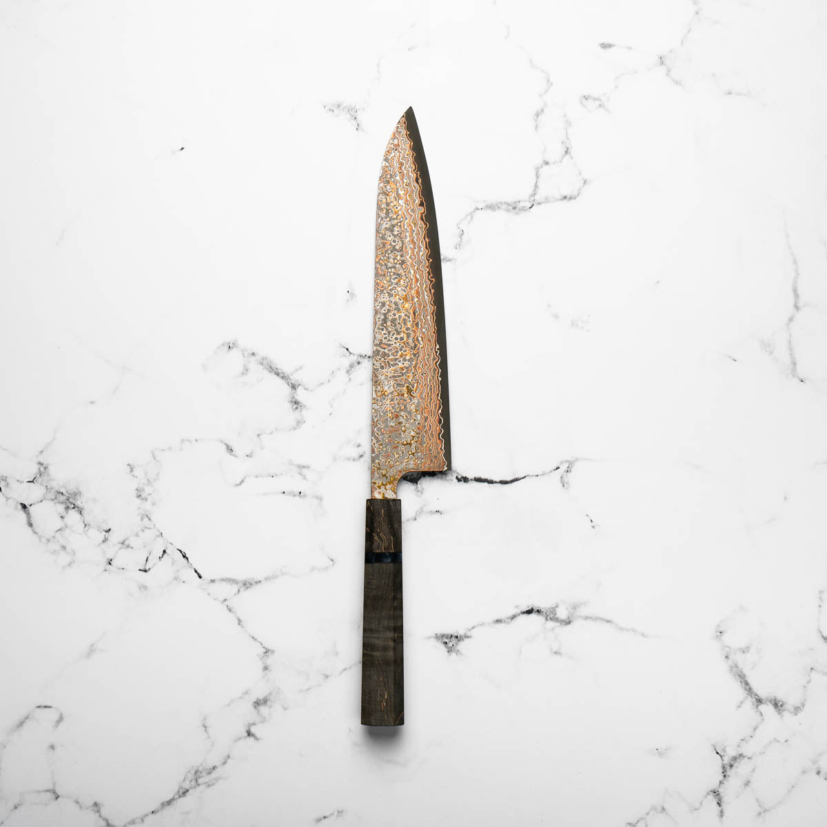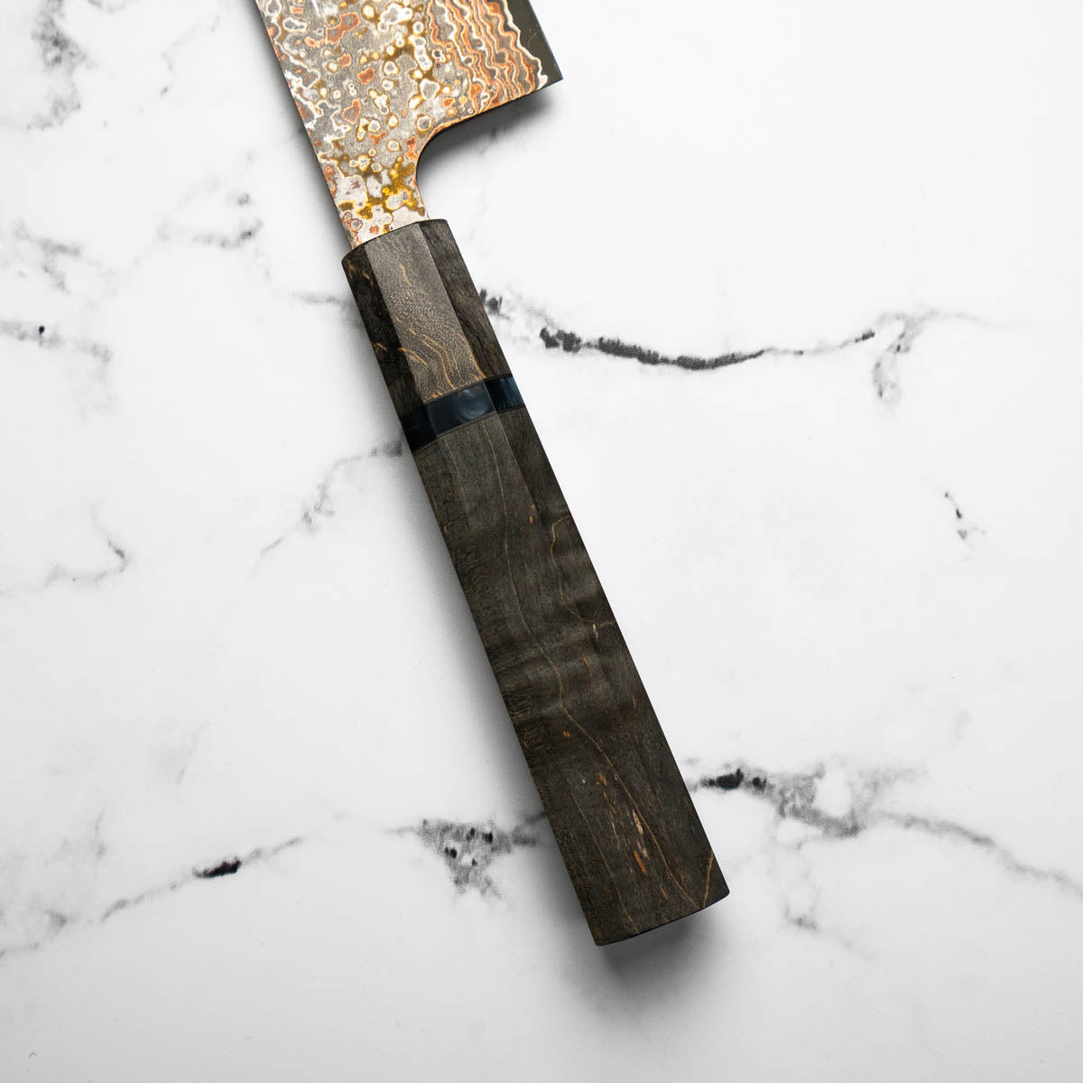 He works across a wide spectrum of steels, from classic Japanese carbon steels to advanced stainless alloys like R2 and VG10. His signature Damascus finishes — including Rainbow, Diamond, and Black Nickel — are unmistakable, and are often paired with an eclectic range of handle styles that reflect both innovation and deep respect for materials.