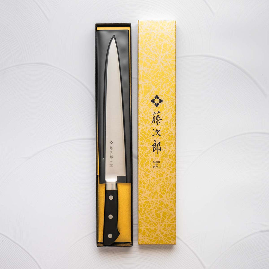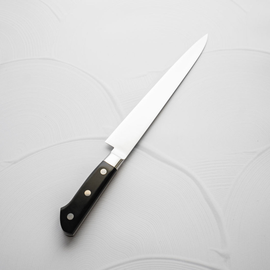 The Sujihiki knife, a traditional Japanese slicer, is designed for carving and fileting. With its long, narrow blade, typically ranging from 240mm to 330mm, it excels in creating clean, smooth cuts through meat and fish. Its length ensures long, uninterrupted strokes, making it perfect for precise slicing tasks.